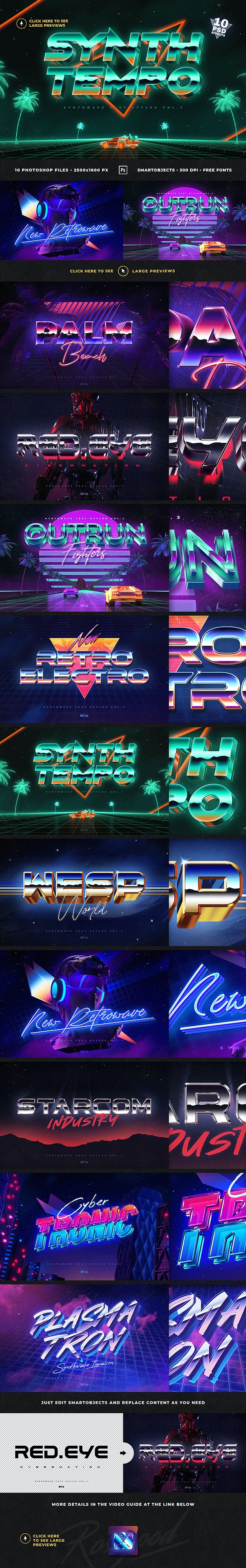 如果您喜欢合成波或反向波,那么您也会喜欢这种惊人的复古80年代霓虹灯文字效果。特别是因为它们非常易于使用。您可以轻松地将图层样式素材应用于形状,文本,矢量或栅格标签和徽标。在网站上创建令人难以置信的传单,海报,明信片,横幅,Facebook,YouTube和Instagram的封面。只需编辑几个智能对象并根据需要替换内容。