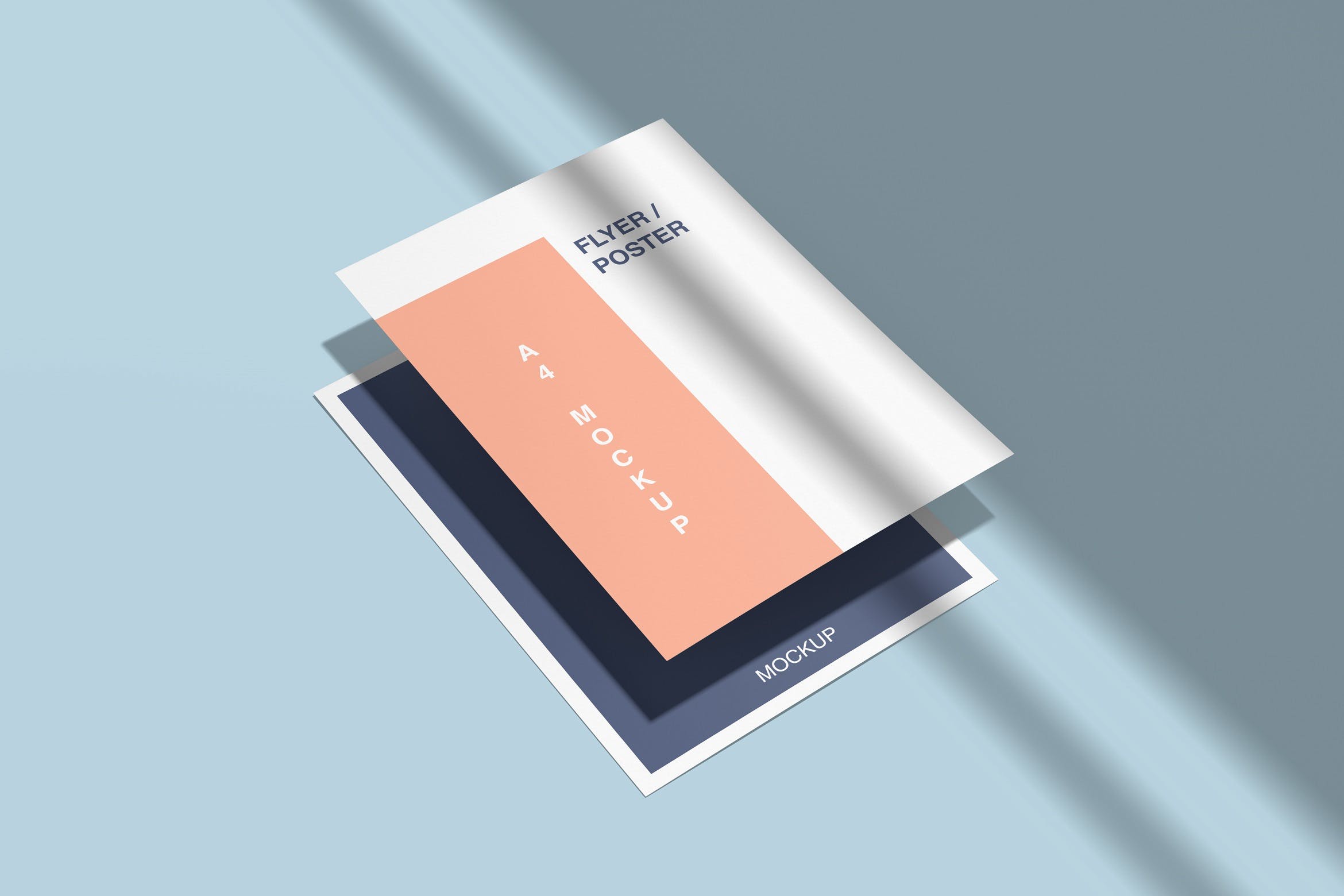 在此带阴影的A4海报&传单样机中展示您的传单或海报设计,以便进行实际预览。这是Photoshop文件的分层智能对象功能,可帮助您更改示例图像。