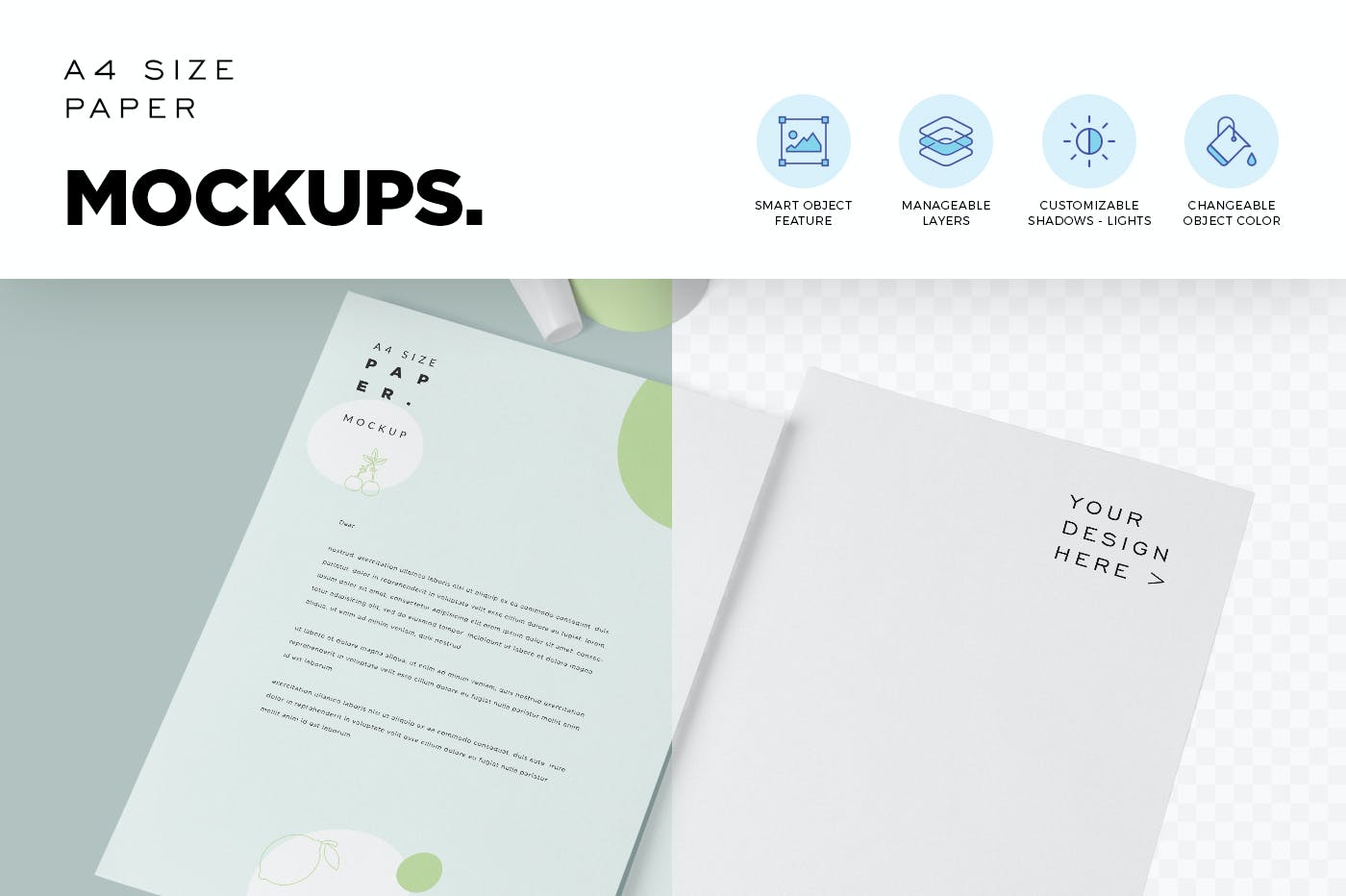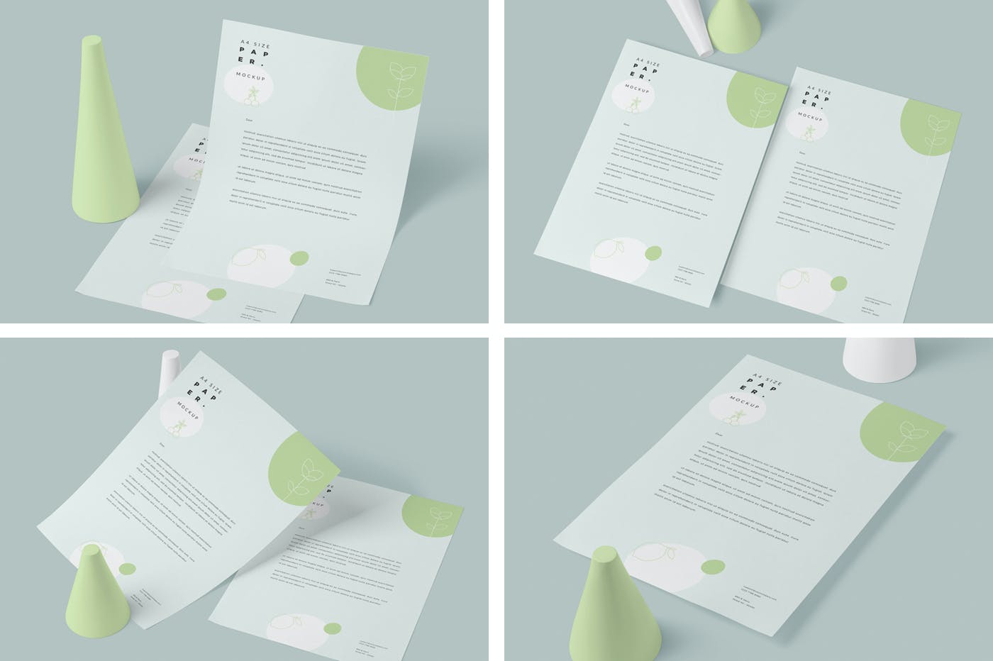 使用这4种A4尺寸的纸张效果图宣传单样机来惊人地展示您的信笺和纸张设计。 您可以使用智能对象功能单击一下,将设计添加到这些纸张样机中。 您还可以使用命名层自定义阴影,效果和背景。