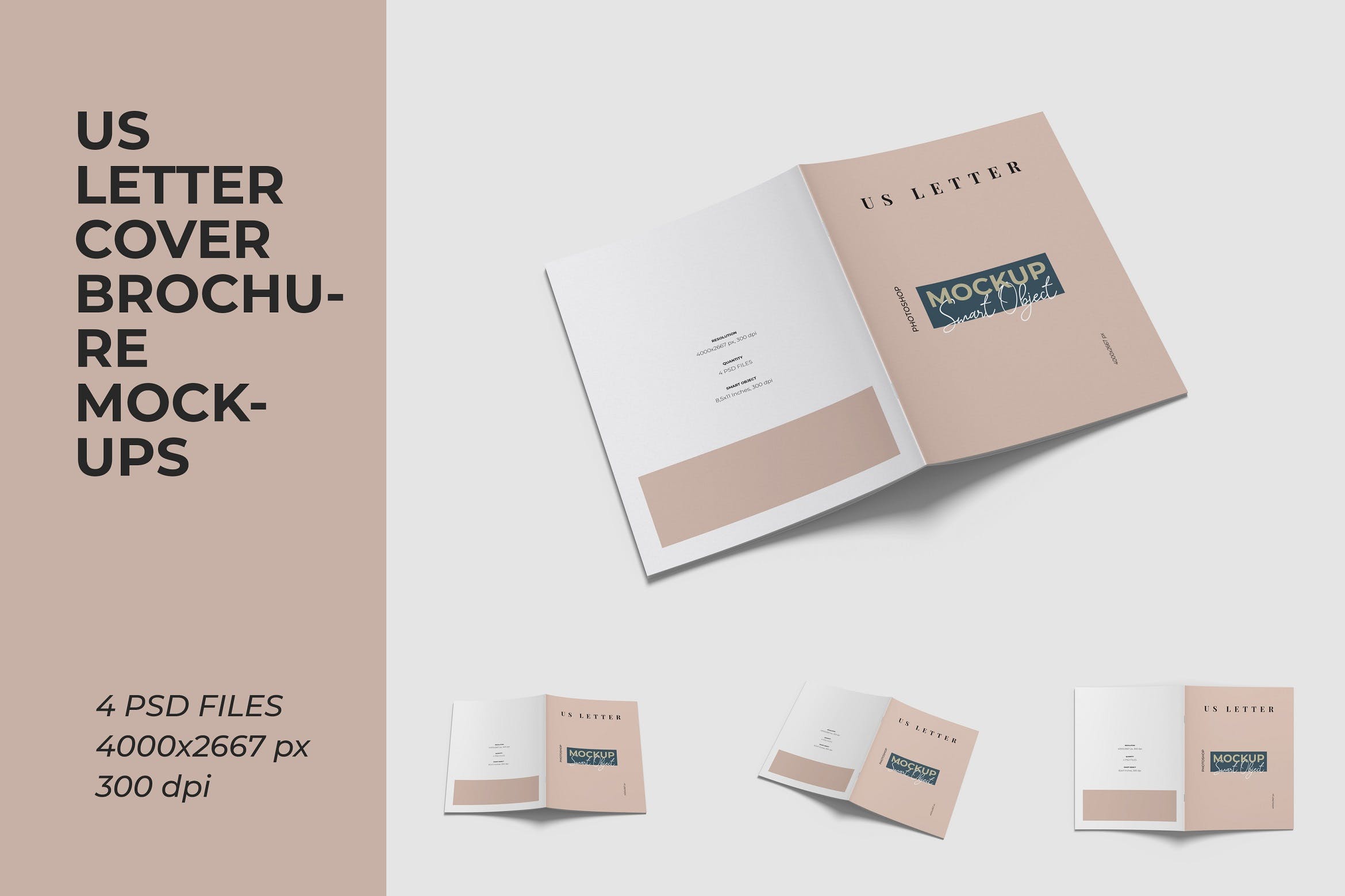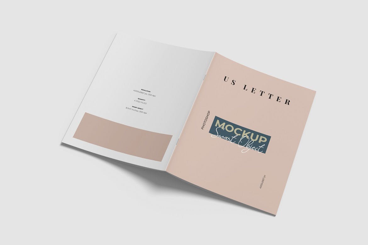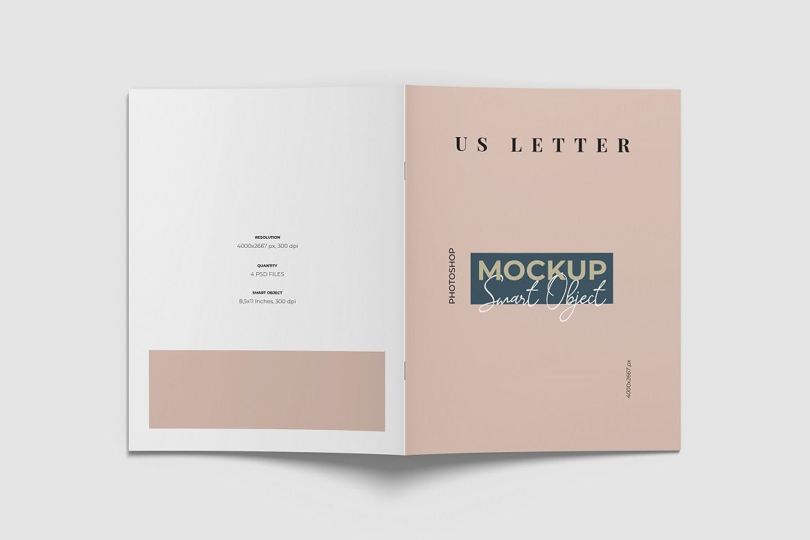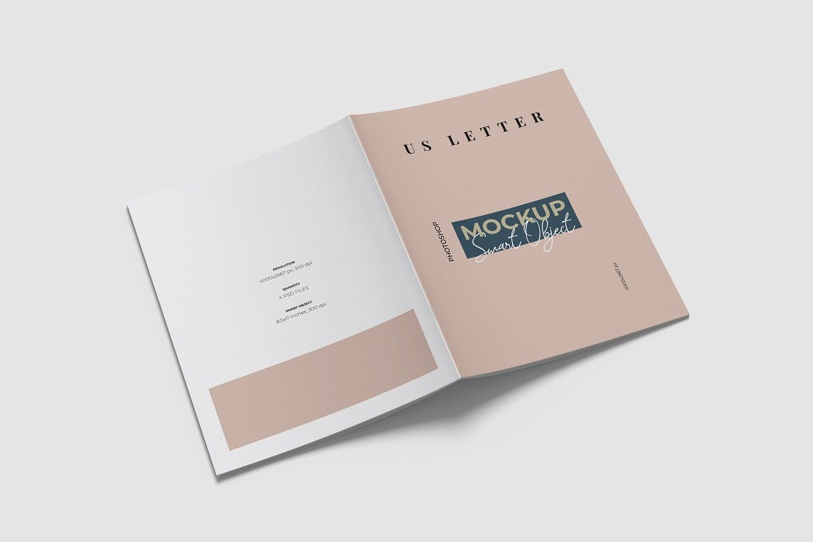 在此美国信纸尺寸宣传册效果图样机中展示您的宣传册封面设计,以进行实际预览。这是Photoshop文件的分层智能对象功能,可帮助您通过封面设计更改示例图像。