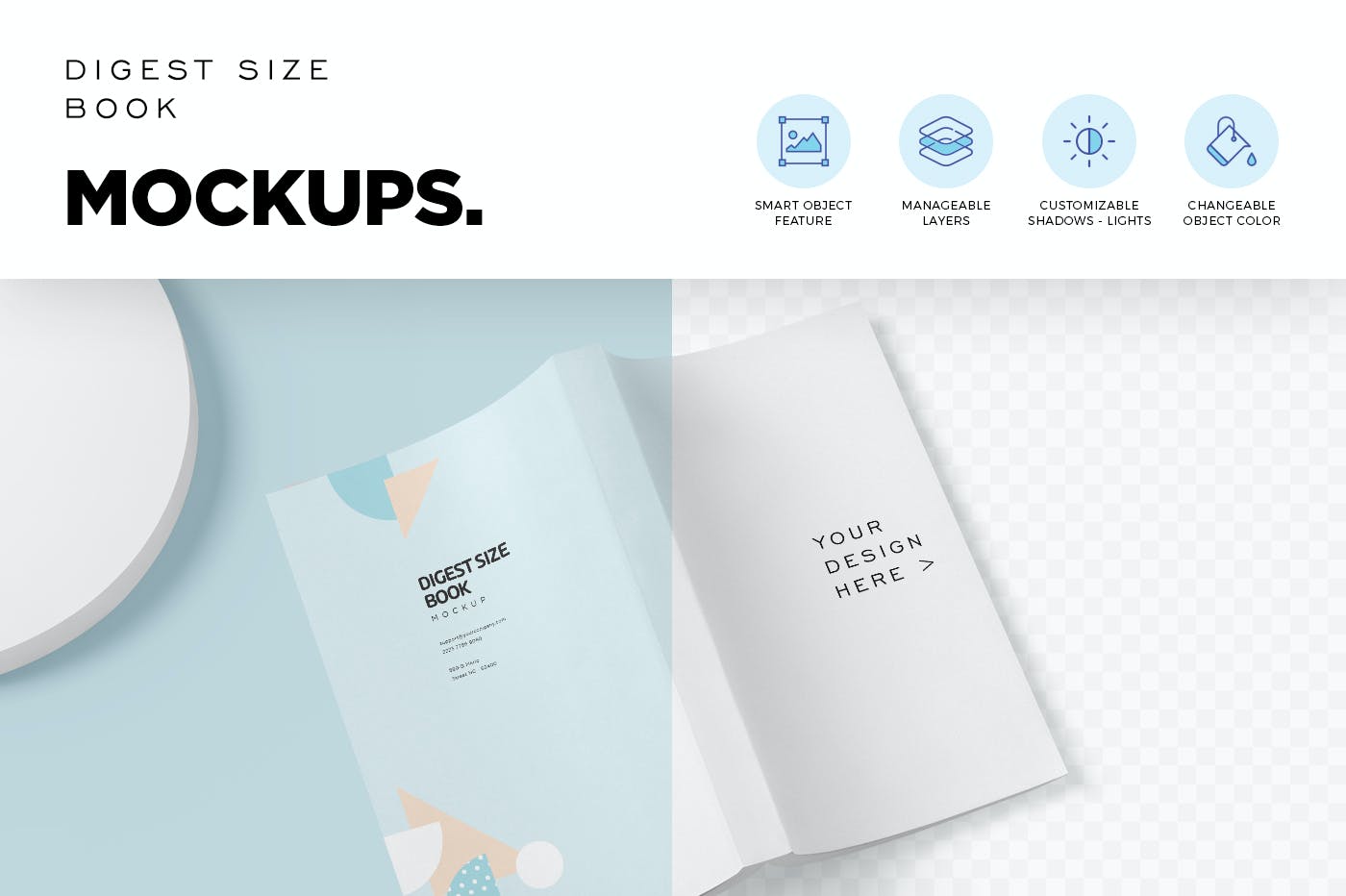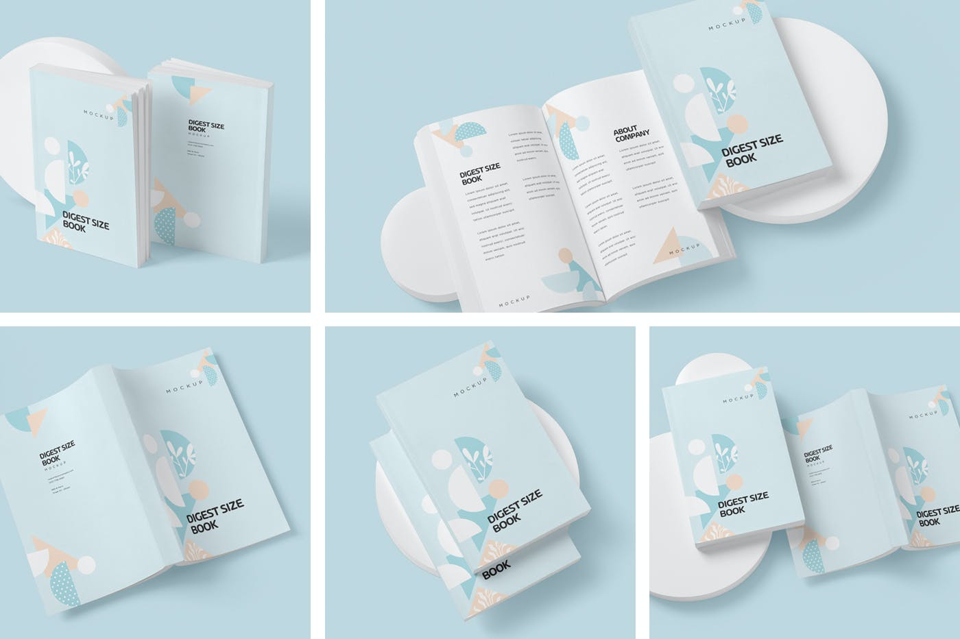 5个精美的文摘尺寸书籍样机将帮助您展示自己的故事书和封面设计。 具有智能对象选项,将帮助您单击添加您的书籍设计。 这些图书样机还提供了智能层来自定义阴影,效果和背景。