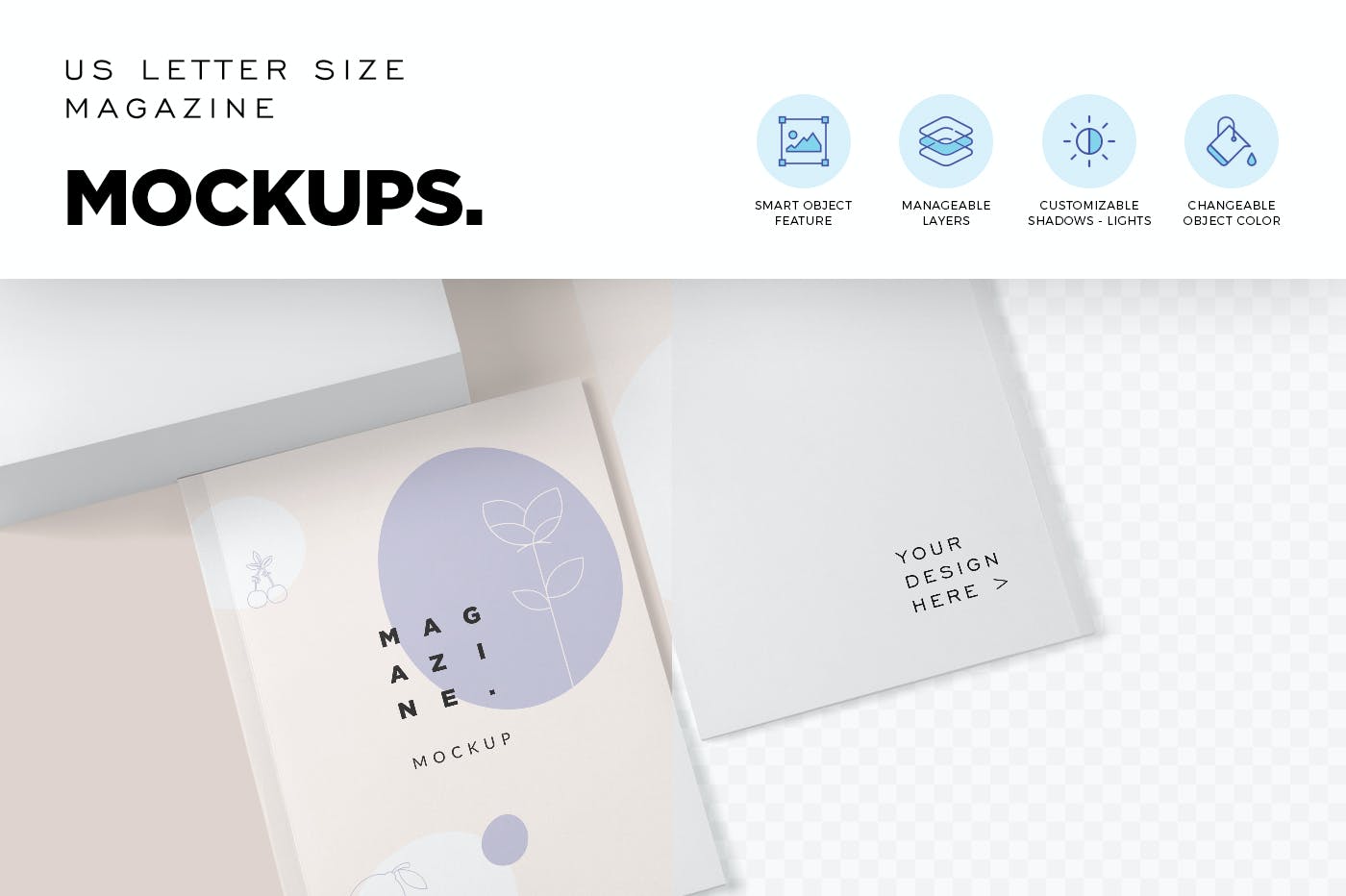 使用这4种美国信纸尺寸的产品杂志设计样机,专业地展示您的任何目录、小册子和印刷广告设计。 具有智能对象选项和命名层,可满足您的个性化需求。 只需使用Photoshop进行所有自定义,就可以展现出惊人的效果。
