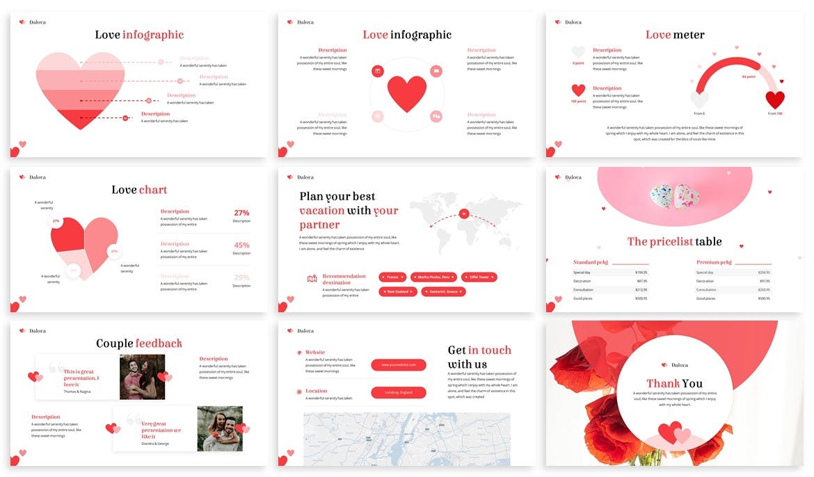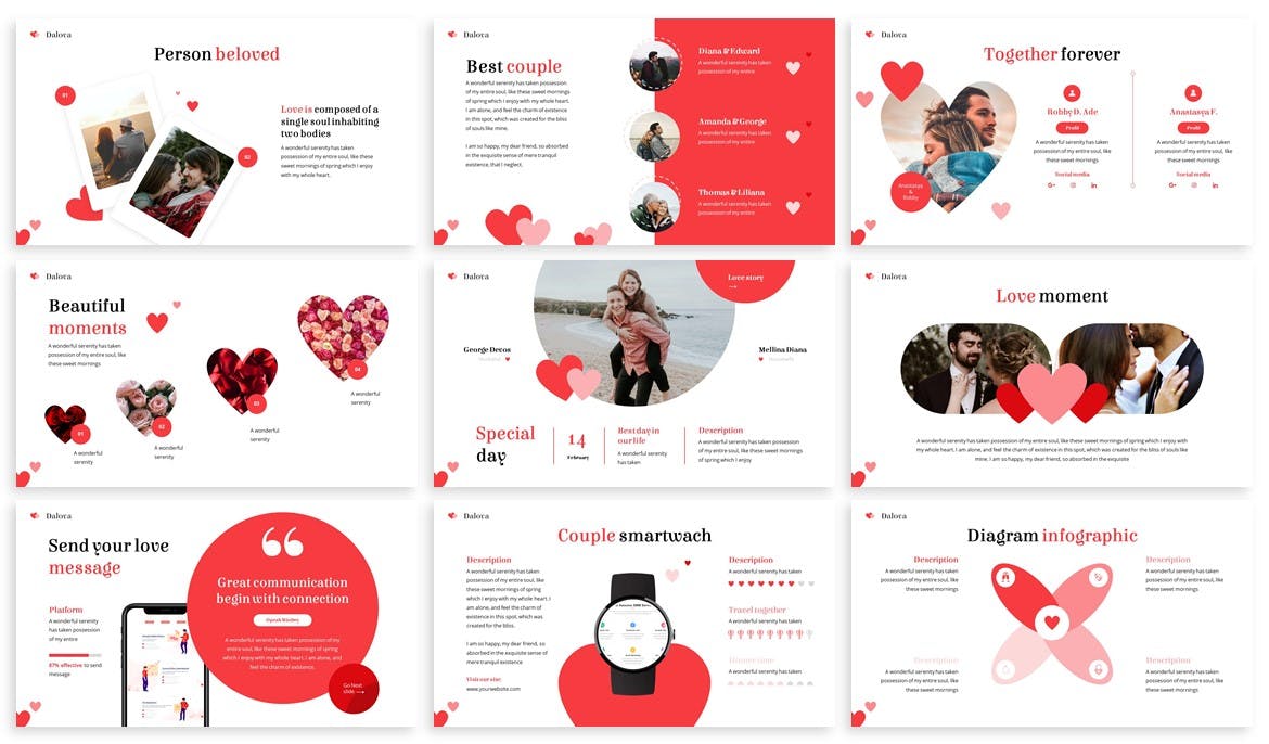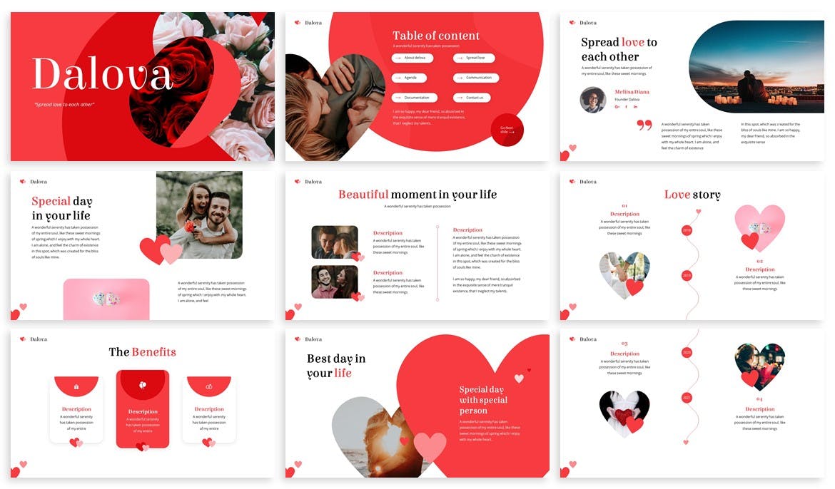 让我们用这个甜美可爱的Powerpoint模板来尝试Dalova模板,你可以用任何你想要的东西和任何目的来创建和编辑它。例如,这是适合婚介,创意机构,时尚等。