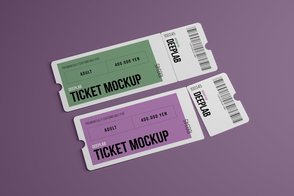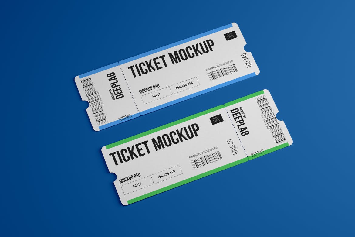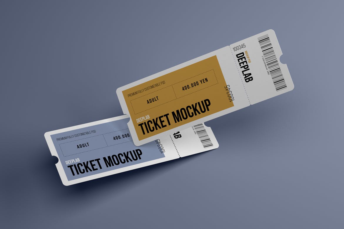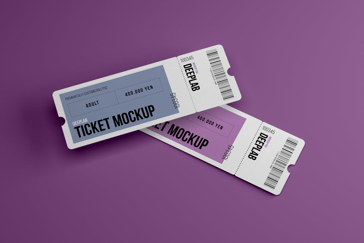 活动门票入场券样机集,在几秒钟内创建一个逼真的入场券设计展示。该PSD文件使用了智能对象功能,因此您可以轻松快速地替换门票样机内容。您只需要双击智能对象,粘贴您的图稿,保存,就可以完成。