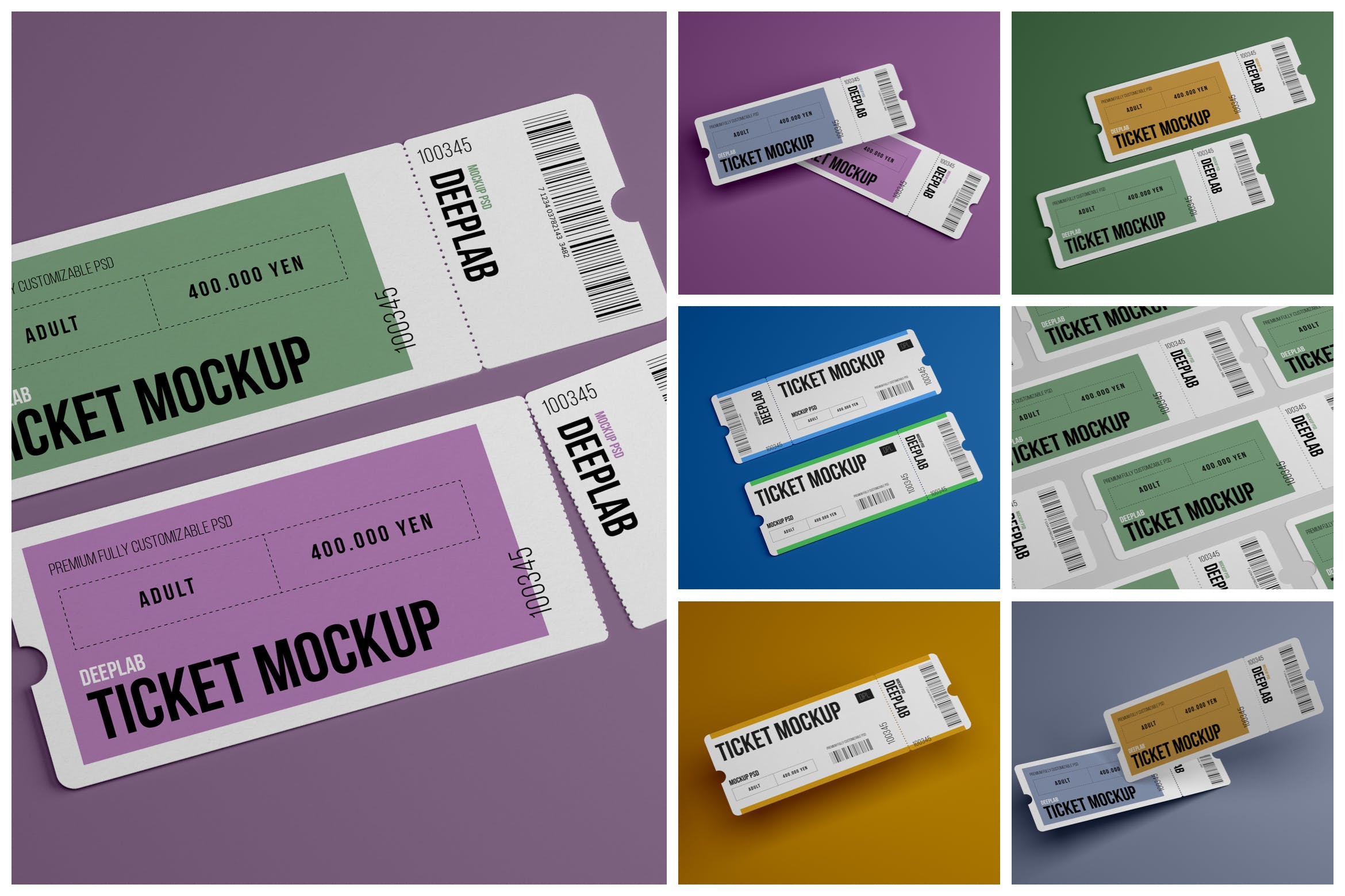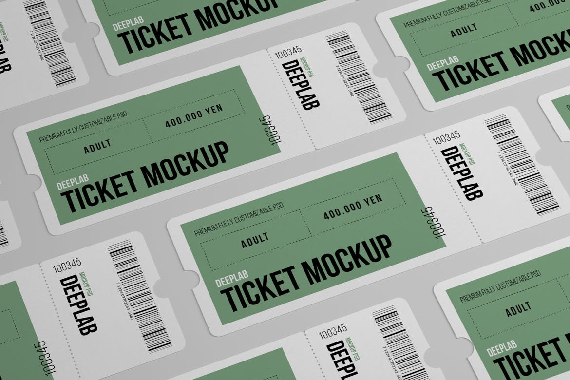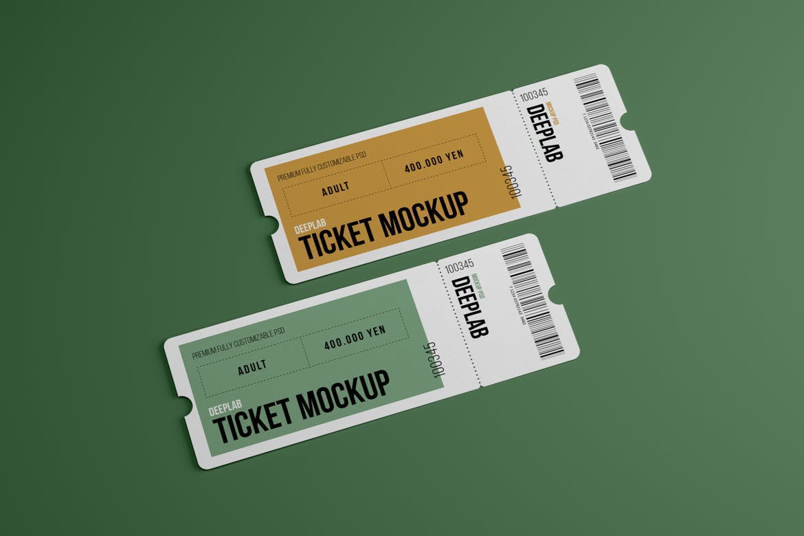 活动门票入场券样机集,在几秒钟内创建一个逼真的入场券设计展示。该PSD文件使用了智能对象功能,因此您可以轻松快速地替换门票样机内容。您只需要双击智能对象,粘贴您的图稿,保存,就可以完成。