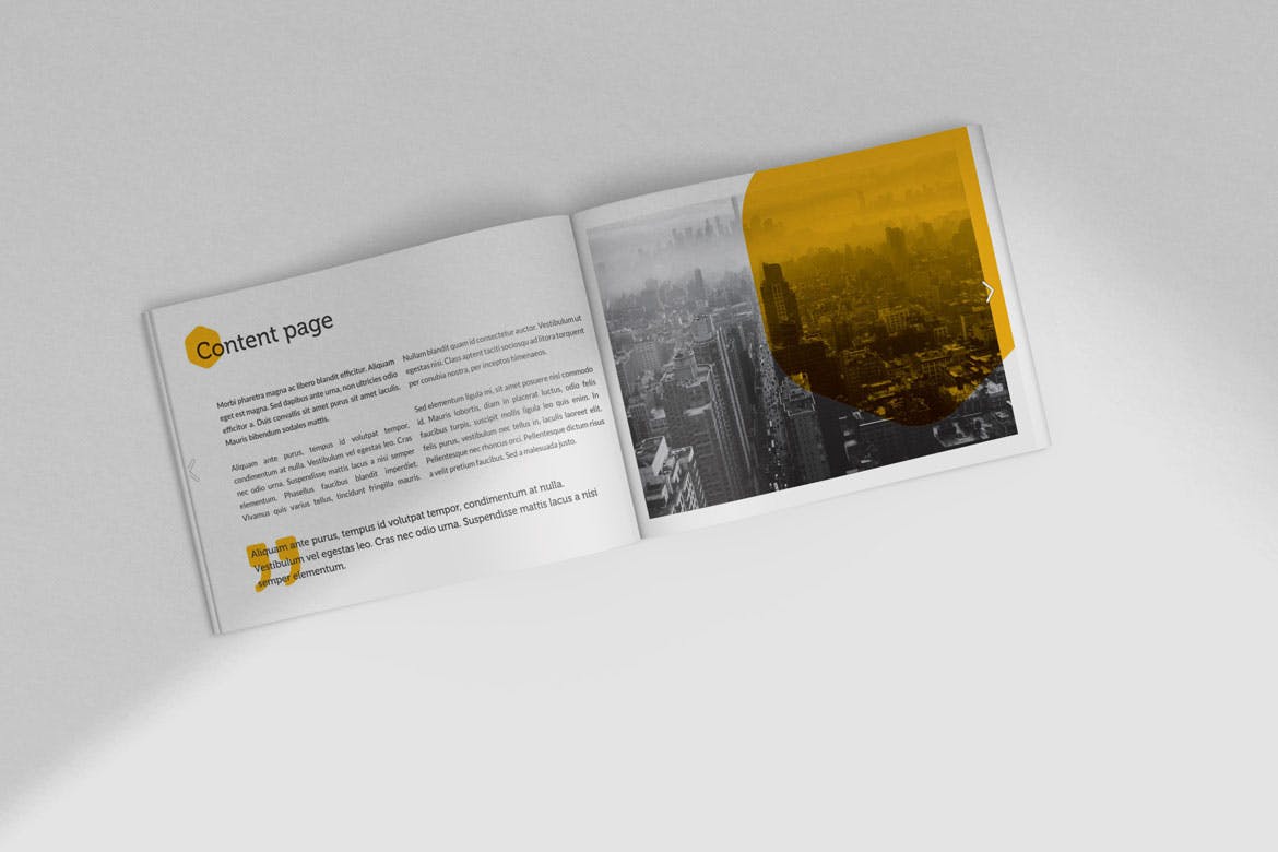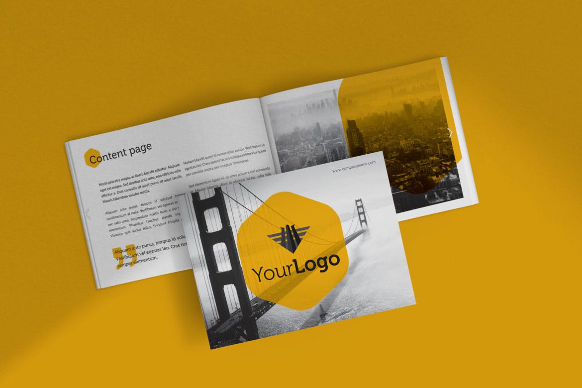 用这个外观新颖的横版宣传册封面&展开页面设计样机展示您的设计。使用 Photoshop 中的智能对象功能很容易应用。因此,您可以在几秒钟内放置您的设计。样机是用结构良好的层创建的。