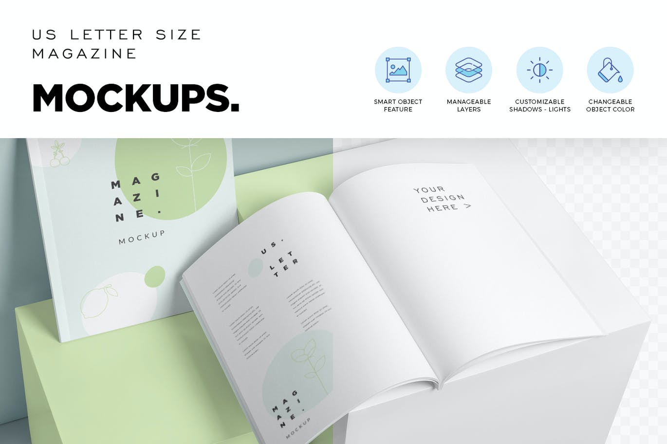 优质的美国信纸杂志宣传册样机,将在真实产品上显示您的社论和印刷广告设计。 这些宣传册效果图样机提供不同的杂志,以展示您的正面,背面和内页设计。 您可以使用智能对象和命名层来个性化设计,颜色,效果,阴影和背景。