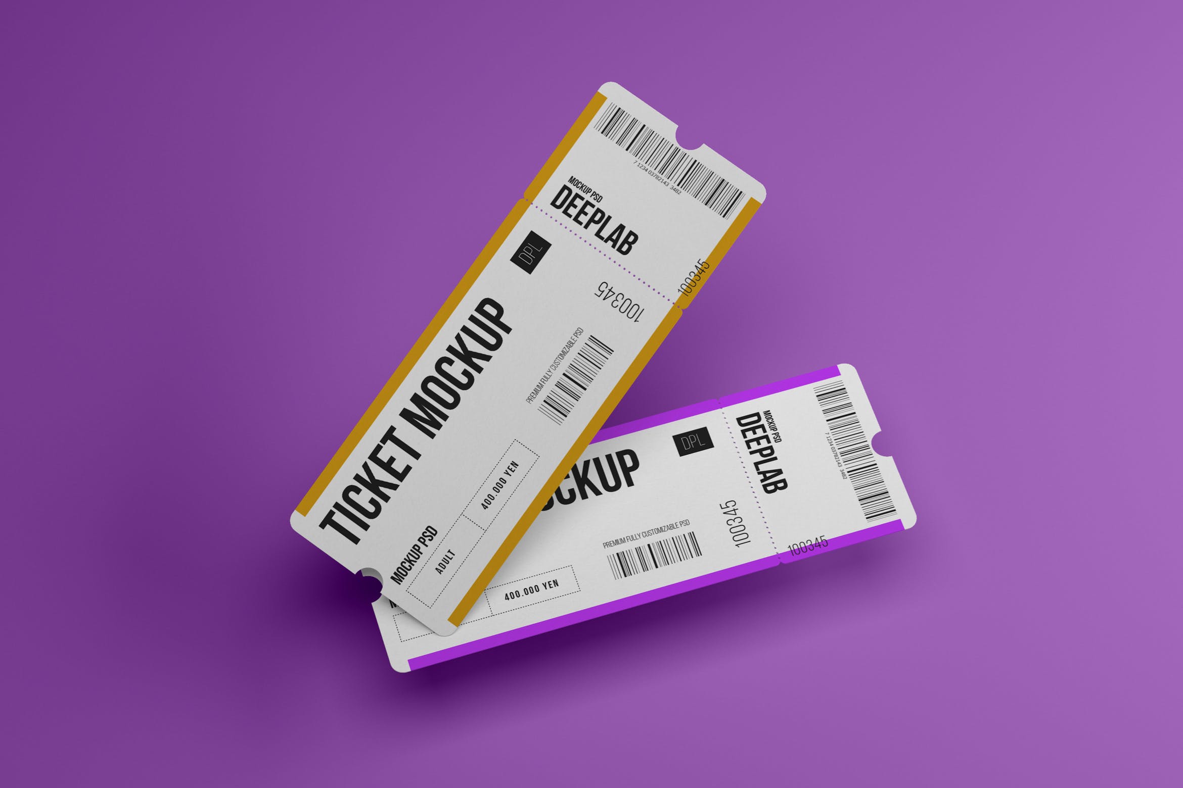 活动门票/入场券/票券效果图样机,展示您的活动入场券!在几秒钟内创建一个逼真的入场券设计演示。该PSD文件使用智能对象功能,因此您可以轻松快速地替换门票样机内容。您只需要双击智能对象,粘贴图稿,保存,就可以完成。