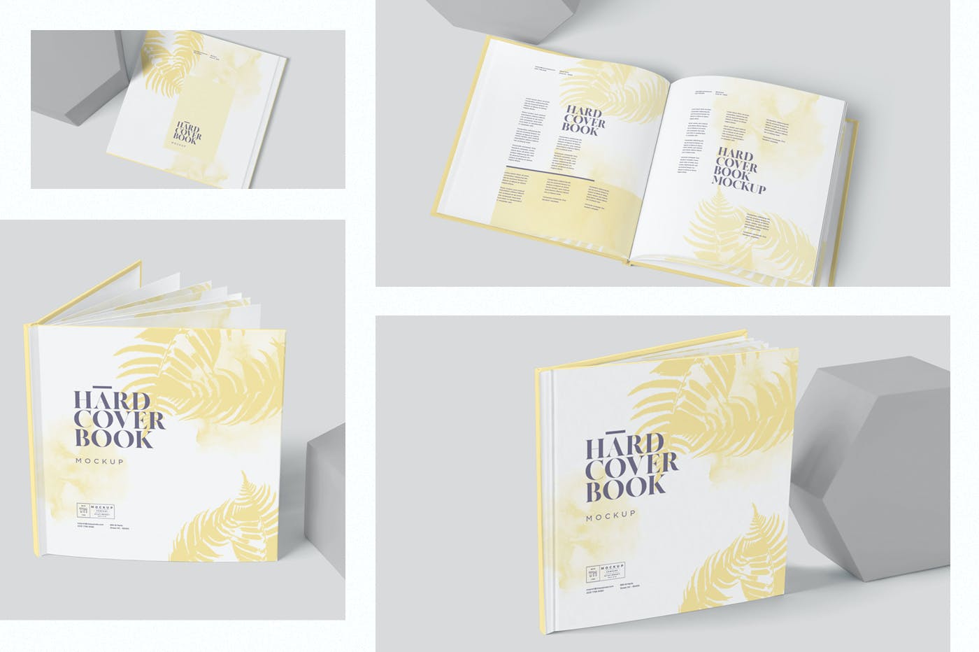 您可以使用这些扁平方形硬壳精装书样机,以惊人的样式展示封面、封底和内页设计。 提供可定制的设计、颜色、阴影、效果和背景。 只需使用Photoshop进行所有自定义,就可以展现出惊人的效果。