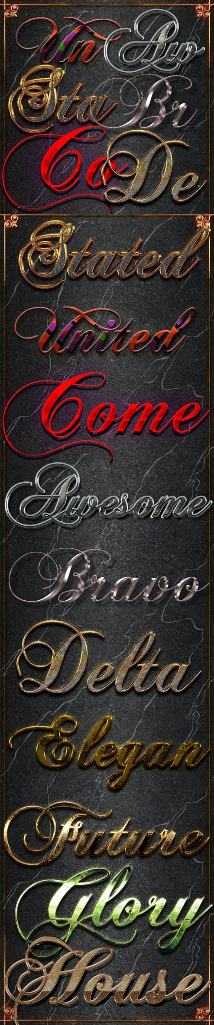 金属光泽3D文字效果,只需单击一下适用的Photoshop文本效果即可。一键适用10种ps图层样式。
