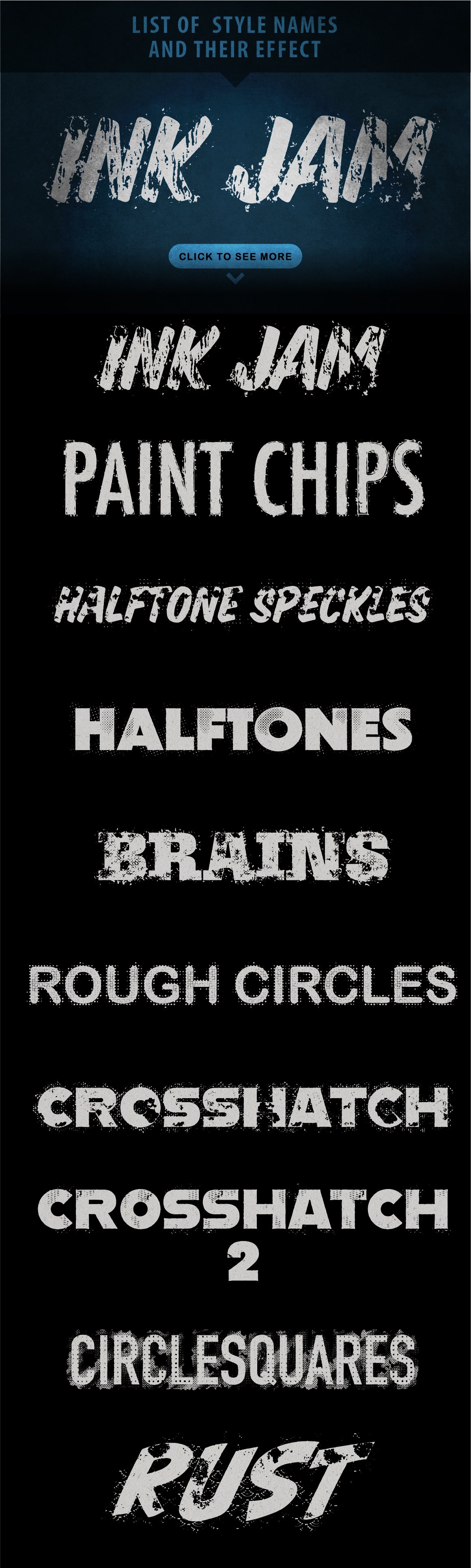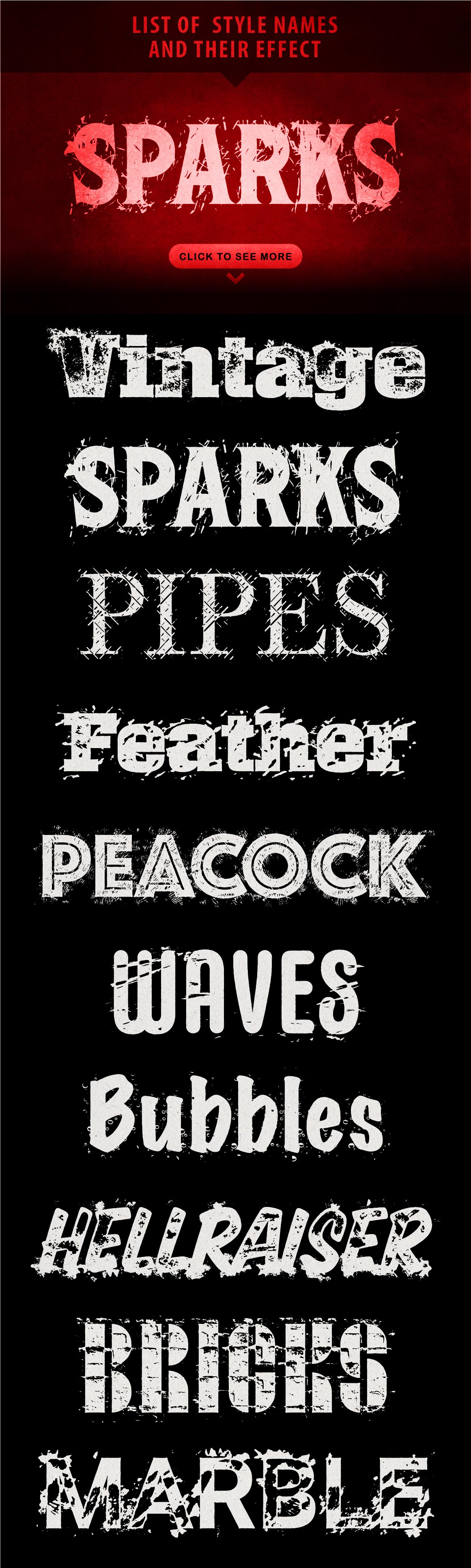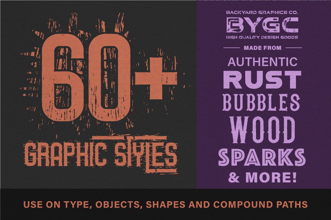 这些墨水印记效果会让您震惊。在Illustrator中使用60多种图形样式。保留所有矢量并将其缩放为所需的大小。这些图形样式将使线条模糊,并为您的徽标或形状提供足够的粗砂纹理。包括木材,铁锈,气泡,火花等纹理。
