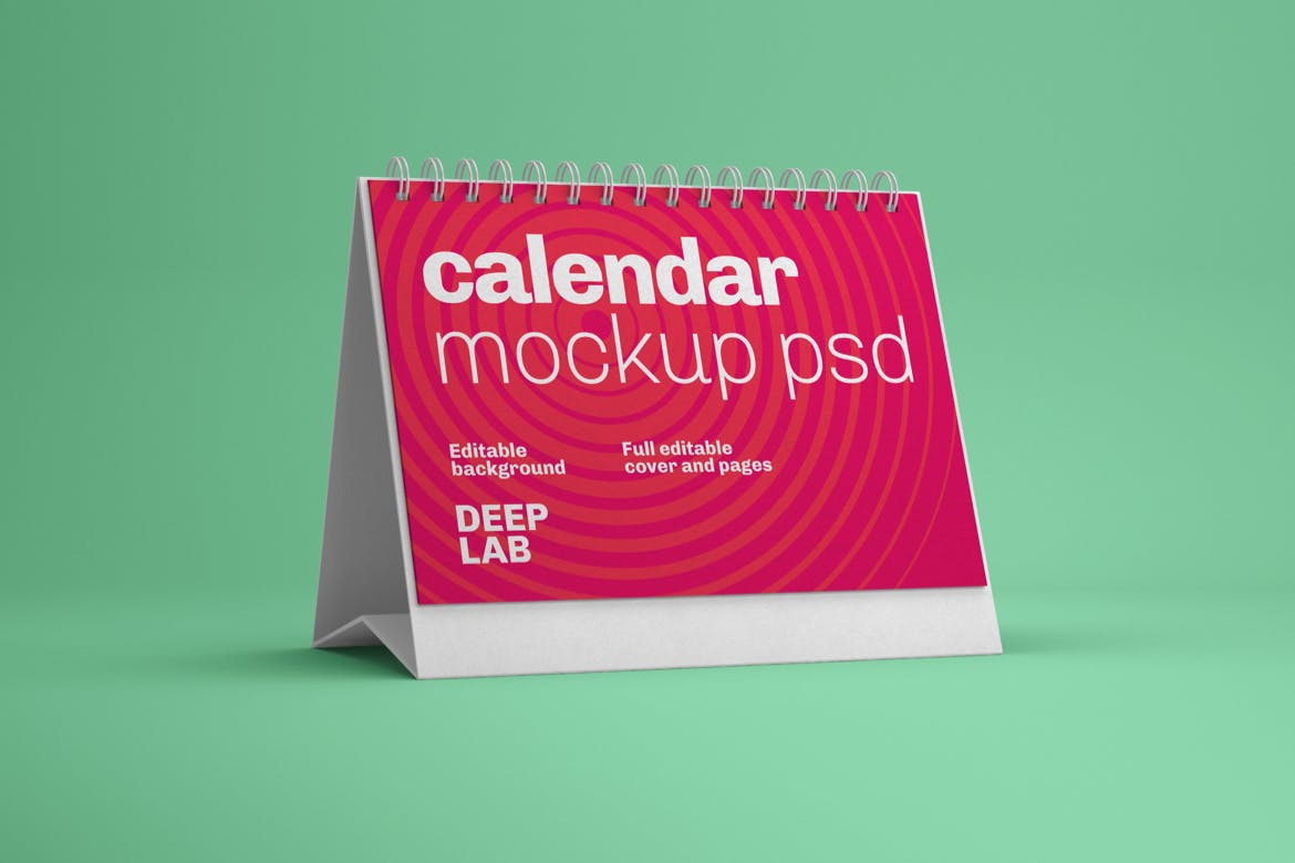 此横版活页桌面日历封面设计效果图样机模板非常适合演示品牌、文具和设计公司的年度日历。该PSD文件使用智能对象,因此您可以轻松快速地替换日历样机内容。
