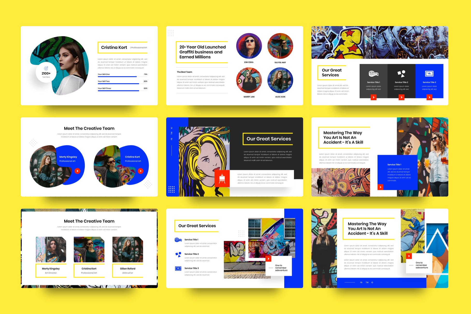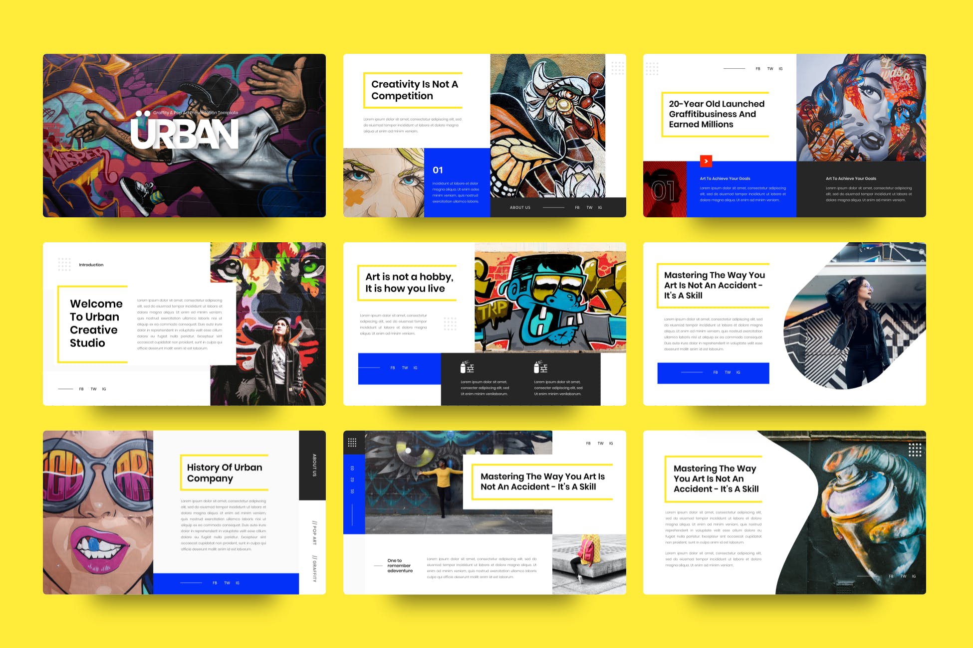 此演示模板可用于各种用途,例如:流行艺术、艺术公司、流行音乐爱好者、涂鸦、艺术家、艺术工作室、街头艺术、商业、代理、工作室、设计,也可用于个人用途。