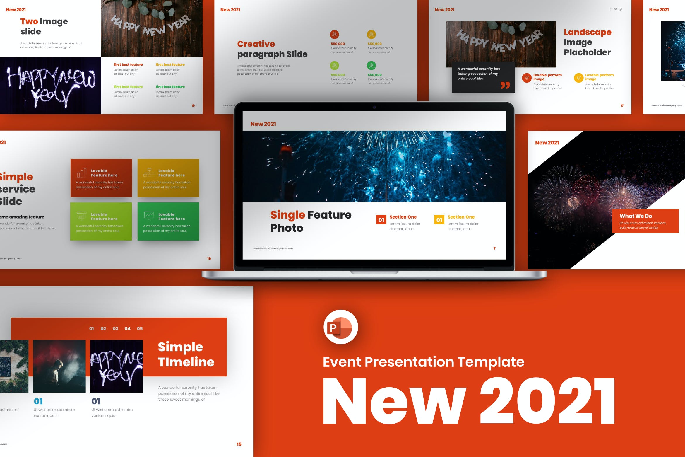 **新的2021年活动演示模板**结合了各种设计方面和可用性,使公司简介模板更具吸引力。每张幻灯片都很有用,功能也更强大。不再有无用的形状和信息图表。想象一下,一个包含数百张有用幻灯片的完整演示模板。非常适合公司简介业务和主题