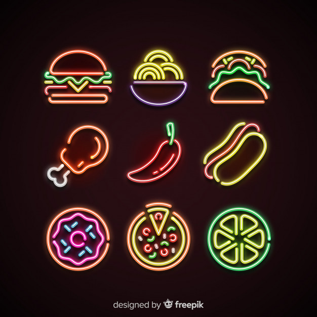 彩色的霓虹灯组成的食物样式,优质的设计,可用于食品店展示、快餐店招牌等等。