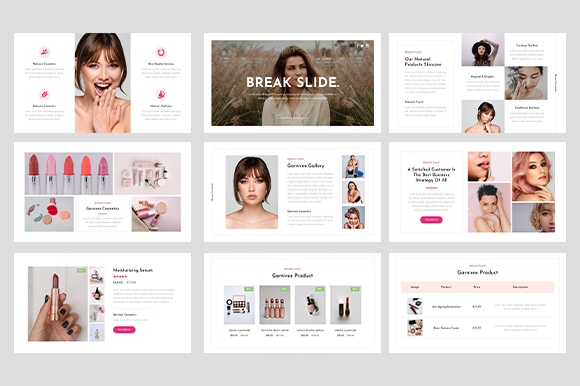 美容与化妆品主题PowerPoint幻灯片模板,该演示模板具有多种用途,可用于任何类型的演示:美容,化妆品,沙龙水疗中心,女性,头发,化妆,时尚,皮肤护理,品牌推广,也可用于定制生产。包含现代,典雅,创意,专业,整洁和独特的布局。注意:演示中的所有图像仅用于预览目的,并不包含在文件中。