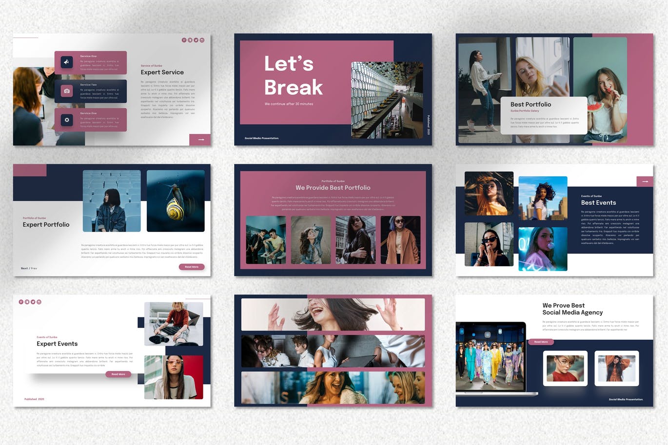 这次老不湿分享的是,时尚高端简约清新专业的社交媒体风格powerpoint幻灯片演示模板(pptx),创意工作室,代理机构,公司,公司,投资组合,摄影,也可以用于个人投资组合。