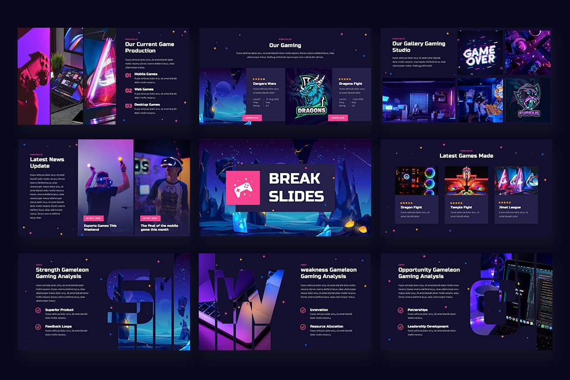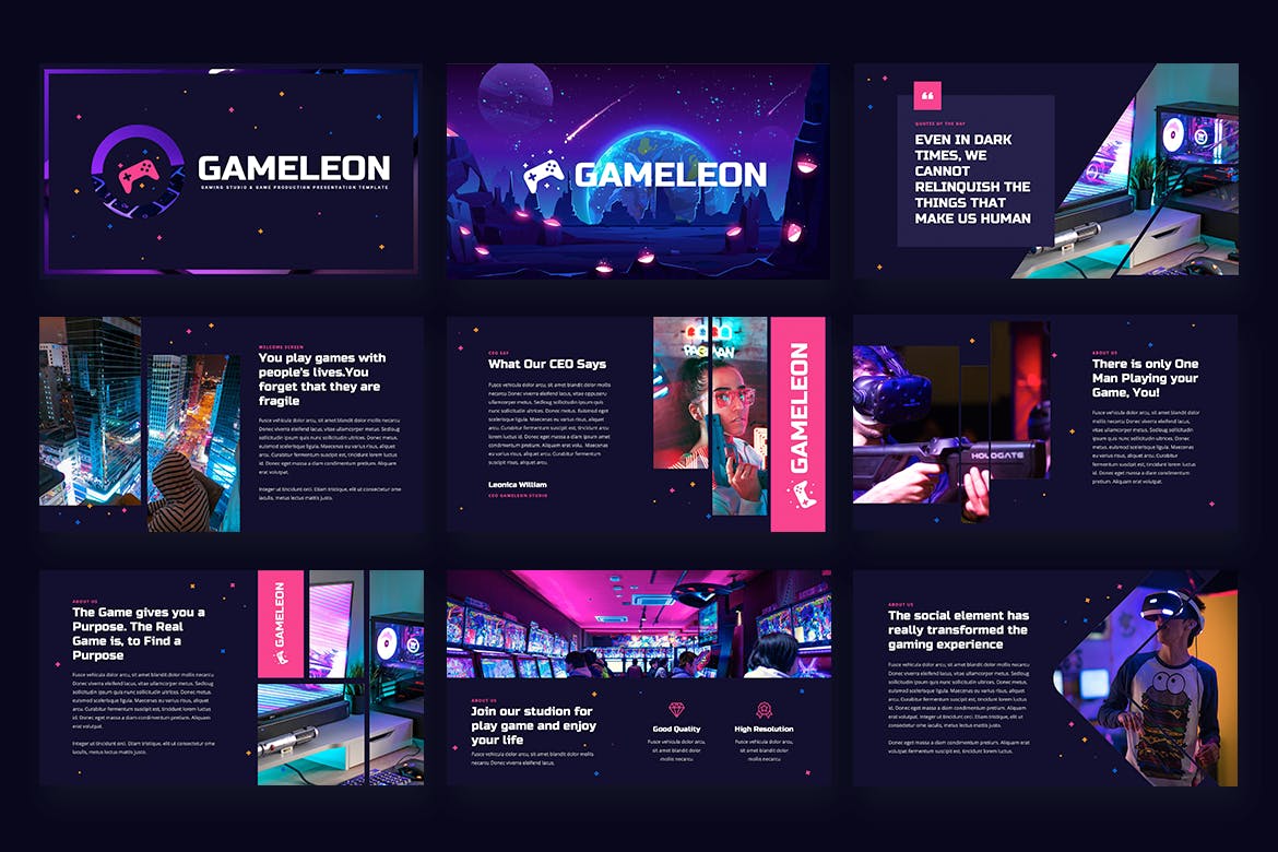 Gameleon–游戏工作室的Powerpoint模板具有专业、超现代和独特的设计,每一张幻灯片都是以热爱和关注细节的方式制作的。