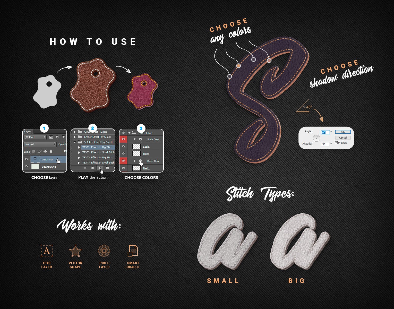 这是一个动作集,有2个皮革纹理,2针大小。你可以选择任何颜色的缝线,皮革,笔划和边缘。你可以选择任何阴影方向。 声明:所有作品均是用户自行上传分享,仅供网友学习交流,请勿作它用。若您的权益被侵害,请及时发邮件联系我们(v918pic@foxmail.com)。在您发送邮件后,工作人员会尽快处理,由于涉及内容不同,所需周期也不同,请您耐心等待。字体特效皮革字体缝合效果 老梦の 海报 链接