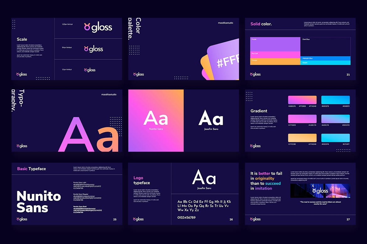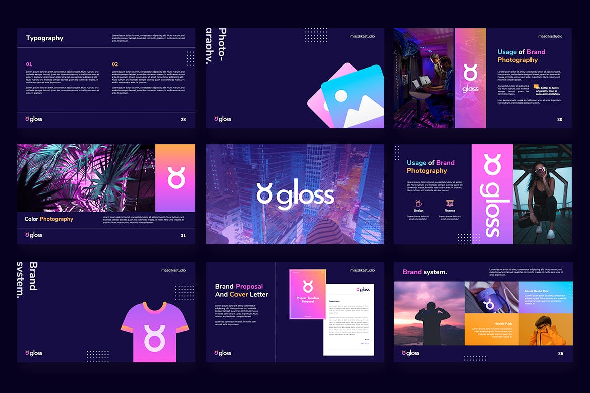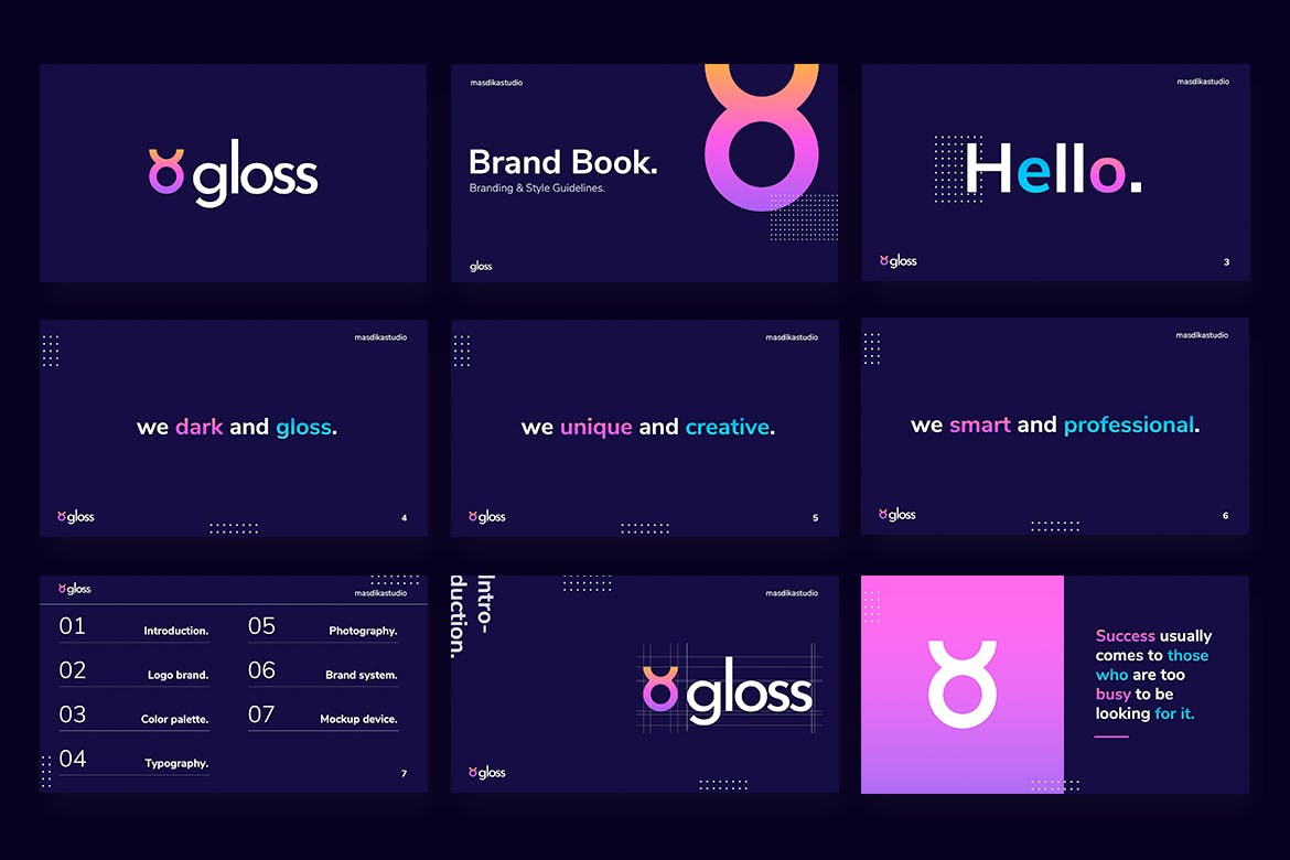光泽-深色品牌和风格指南Powerpoint模板是一个多用途的品牌指南Powerpoint模板,可用于任何类型的演示文稿:商业、投资组合、公司、品牌、指南、深色、渐变项目,也可用于定制制作。