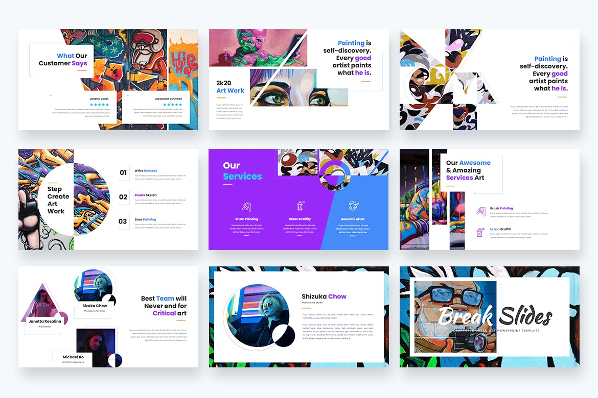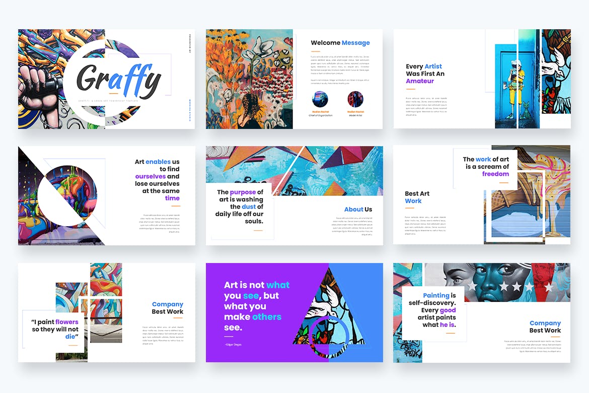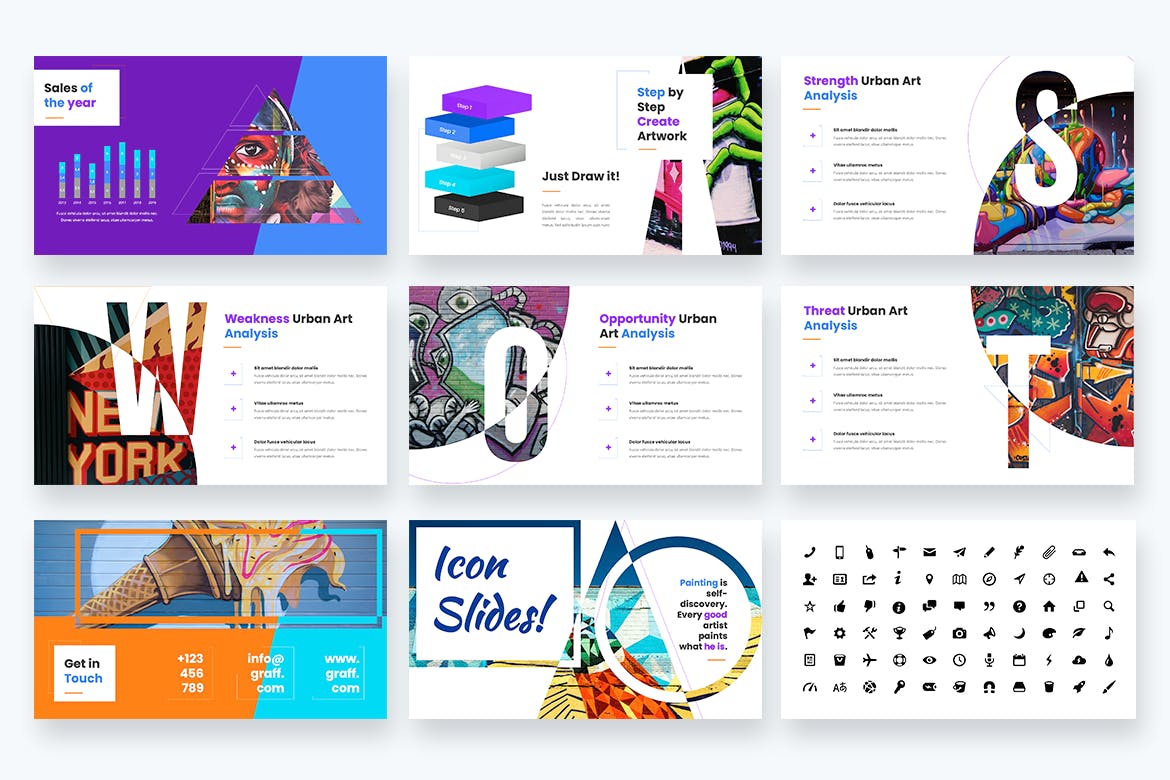 **Graffy–Urban Art&Graffiti Powerpoint模板**具有专业、超现代和独特的设计,每一张幻灯片都以热爱和关注细节的方式创作。