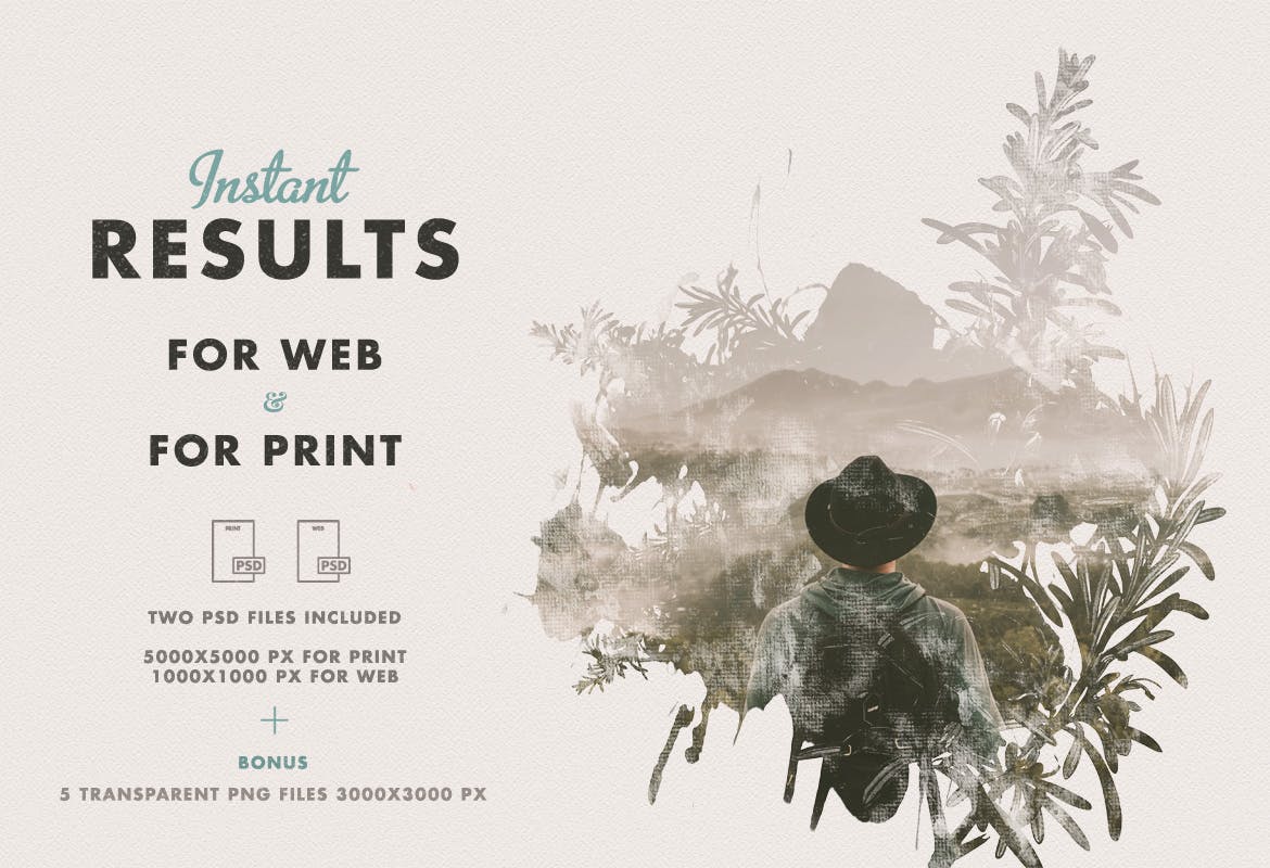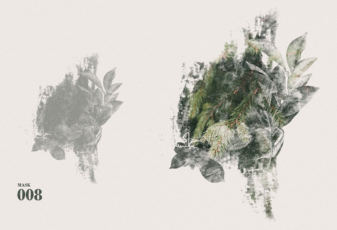 这次老不湿分享的是,时尚高端优雅水墨手绘水彩风格的双重曝光照片叠加效果图层样式vol.02,5个艺术水彩面具第02卷-手绘,水彩纹理,艺术面具,为您的照片