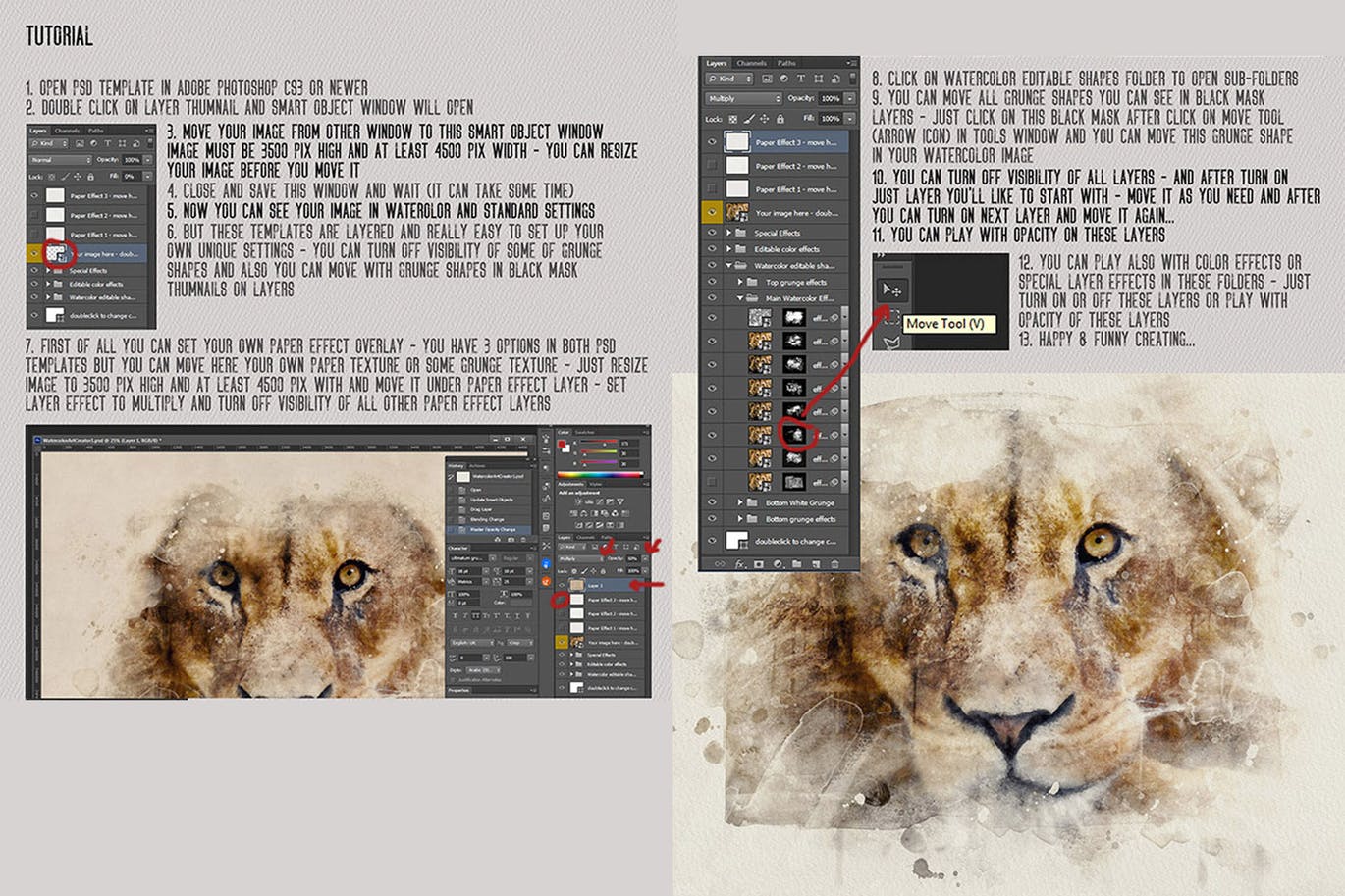 只需将您的照片放在智能对象中-关闭并保存-就这样:)您将从照片中获得新的水彩作品!您可以更新纸张纹理,编辑效果,使用所有画笔蒙版移动。因此,您可以在数分钟内为水彩照片作品创建完全独特的画笔形状。