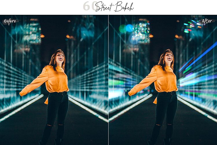 此款套装包含60款不同类型的散景灯、彩色、照片和闪光效果。可用于所有类型的夜间人像照片、夜间照片、街道图片、城市图片、婚礼、风景照片、自然和肖像照片。适合各种照片、广告、活动屏幕显示、电影场景等。