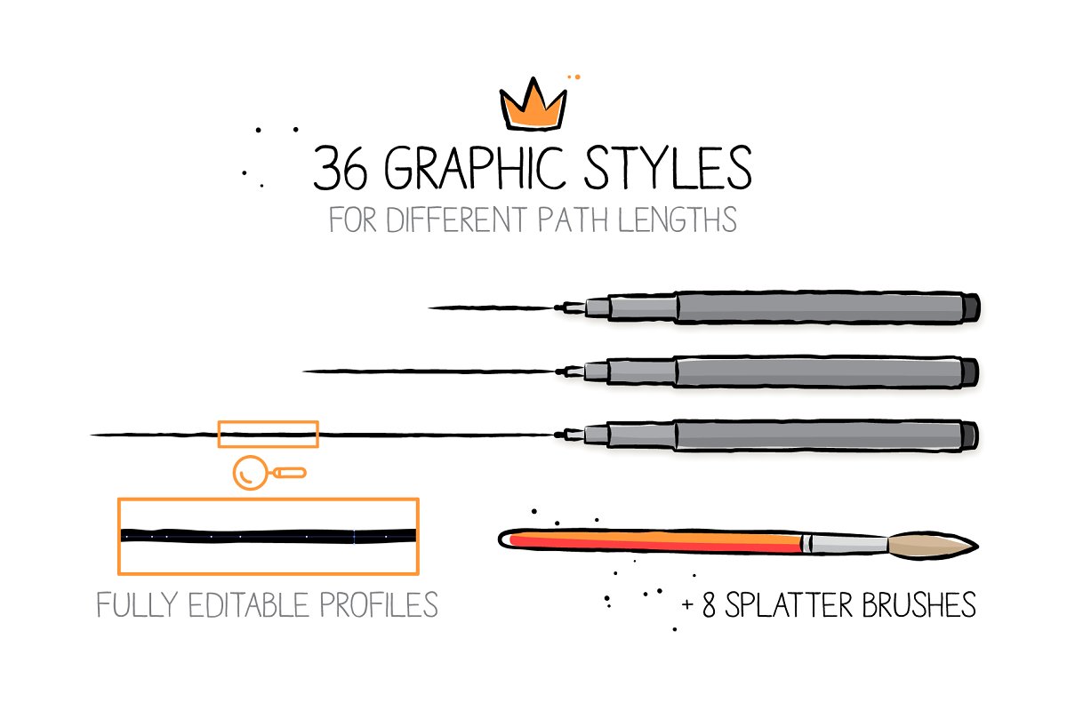此套装内含36个手绘图形样式的库以及8个泼溅画笔。 这些精美的图形样式模仿了在绘画时手的自然颤动。