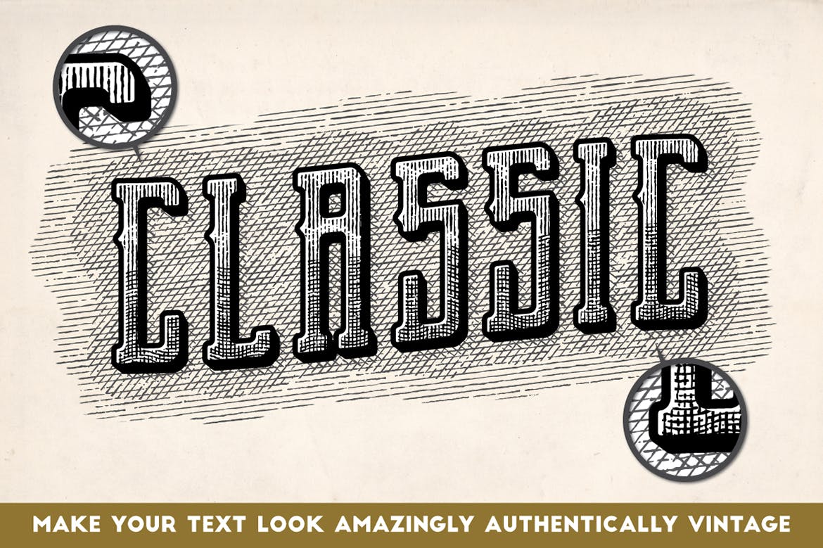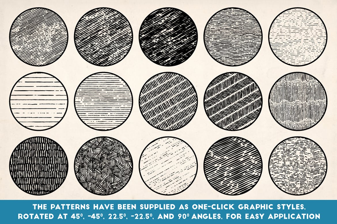 这个漂亮的快捷方式使用起来非常简单 – 只需将图案以不同的旋转方式分层,即可创建阴影并建立阴影。如果这还不够容易,我还提供了不同旋转的每个模式作为一键式图形样式(90,22.5,-22.5,45和-45度),以进一步减少所需的时间创造你的复古艺术!