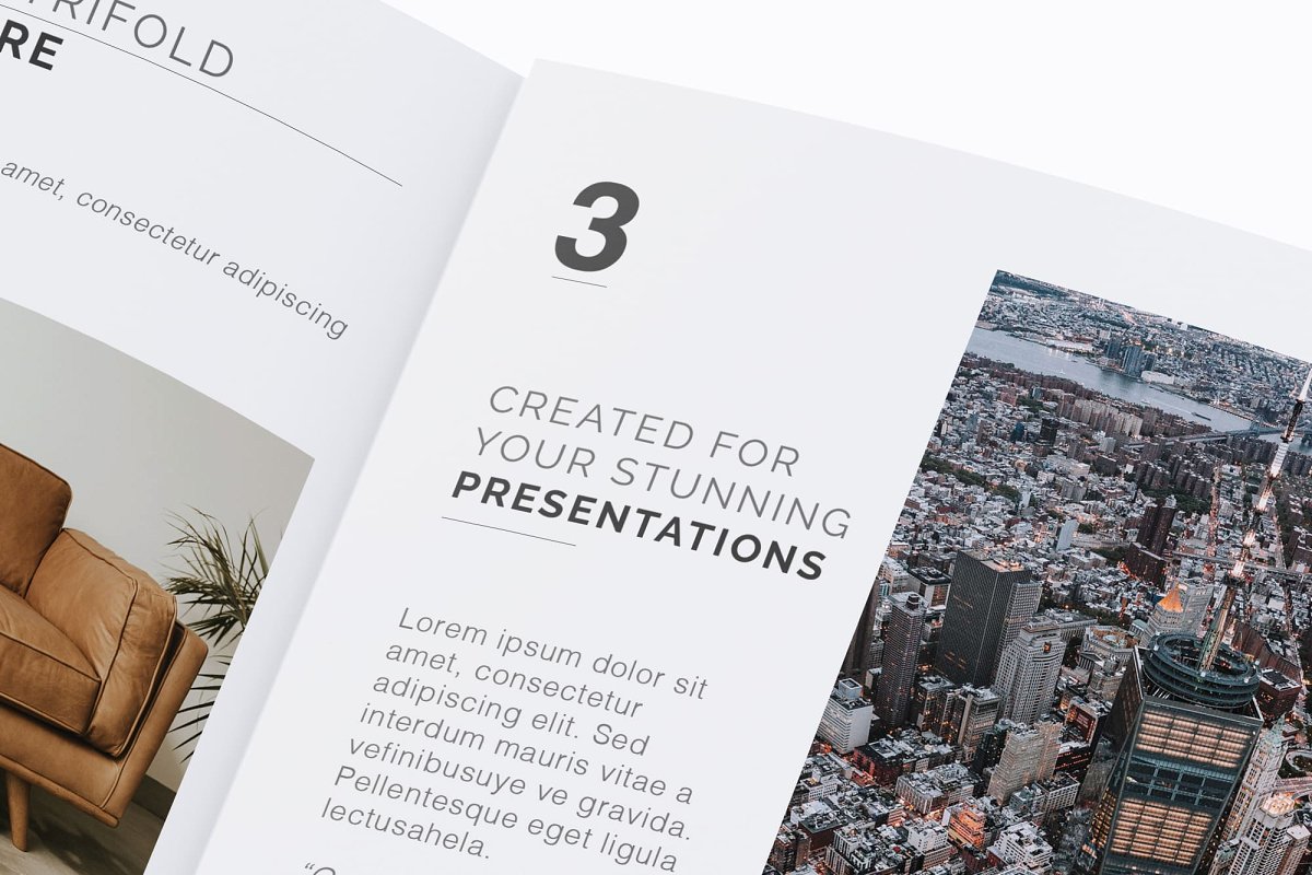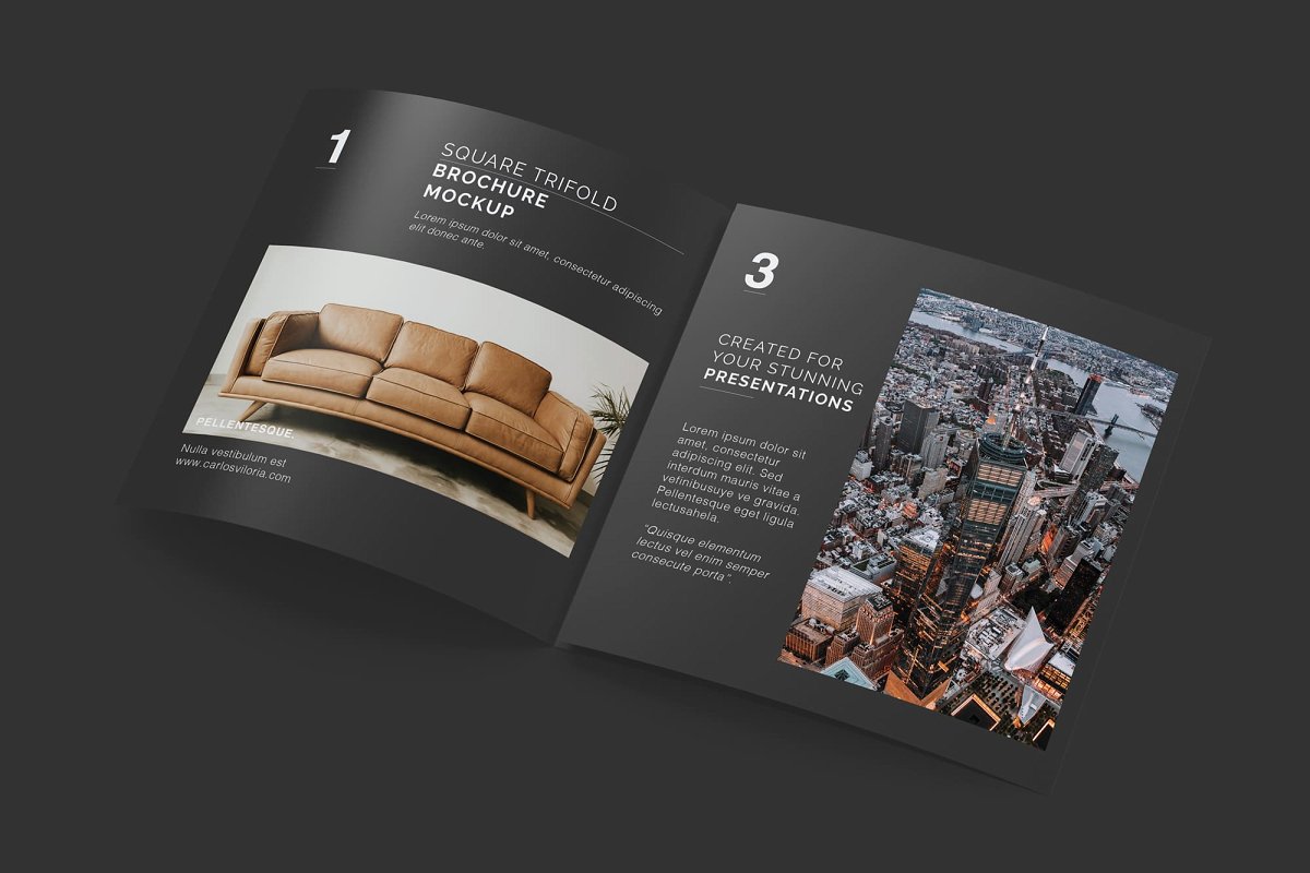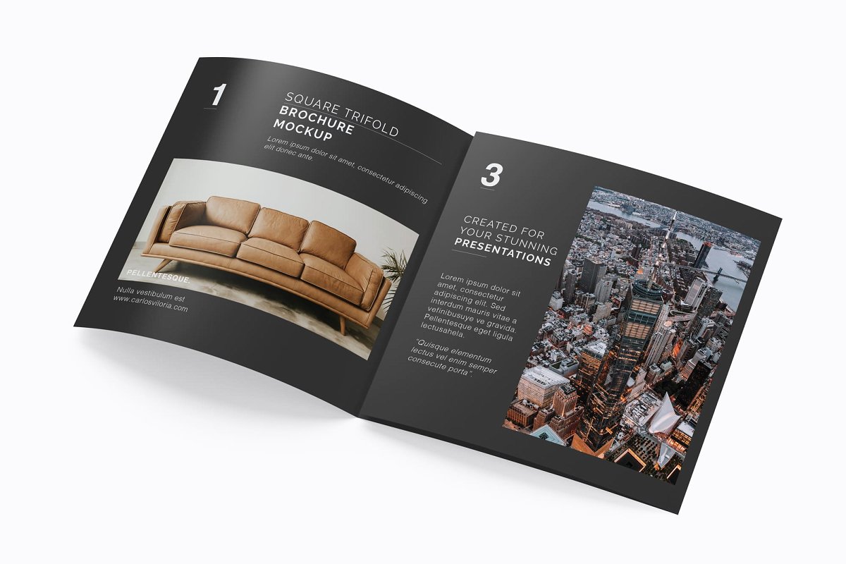 一个漂亮专业的方形三折页宣传册样机。只需使用Photoshop并按照“帮助指南”图层中的说明进行操作,非常简单,只需几秒钟就能演示文稿。您还可以轻松更改背景颜色或增加阴影和亮度的不透明度。