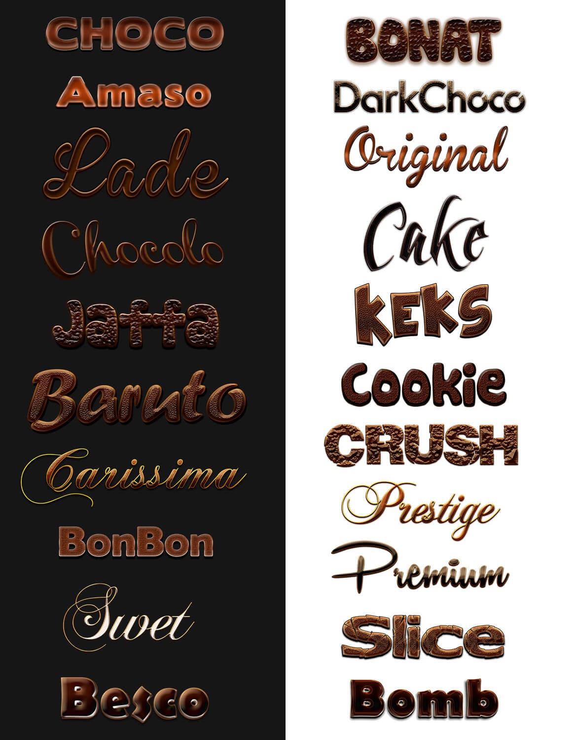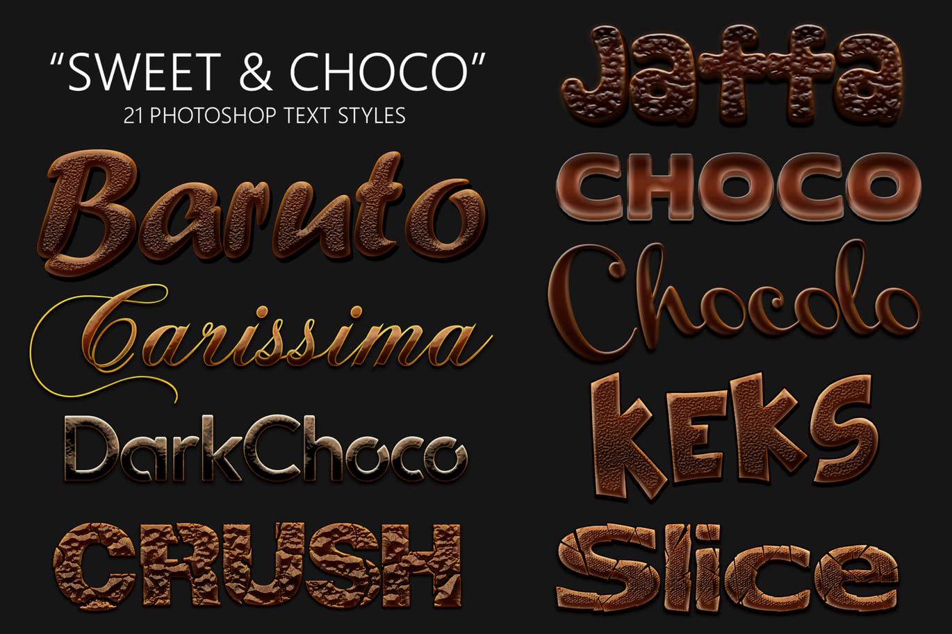 这次老不湿分享的是,21个3D立体Sweet和Choco巧克力糖果质感Photoshop图层样式大集合,可以应用于某些主标题或徽标/包装设计。包括两个版本的背景。