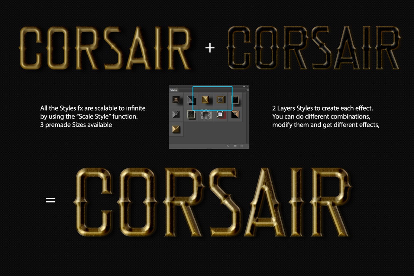 更多信息 这些图层样式在任何类型的字体中都很完美,主要是在深色背景上。在创建任何混合媒体广告时很有用,这些效果适用于许多项目:复古或豪华徽标效果,游戏应用程序,视频游戏标题,个人或商业身份。