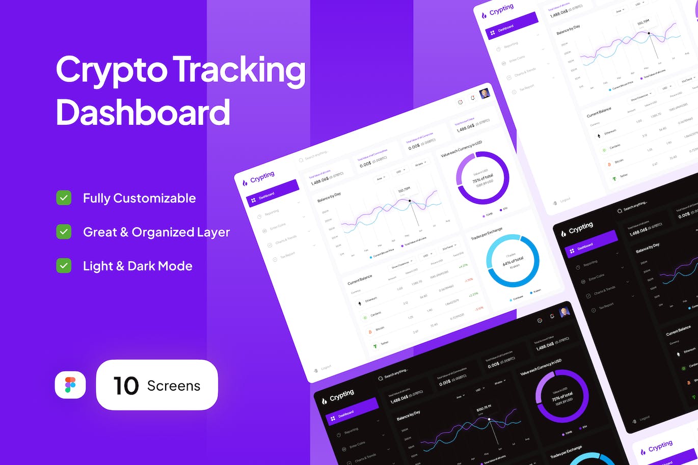 Crypting是Crypto Tracking Dashboard,具有干净、简约和现代的设计。加密是适合的,易于完全定制,以满足您的需求。在亮和暗模式下可用。易于在Figma中使用。在本部分中,您可以获得10个高质量屏幕,其