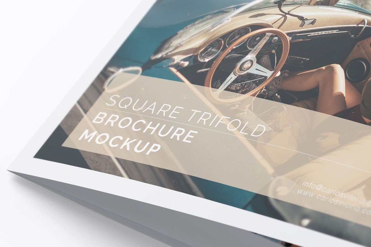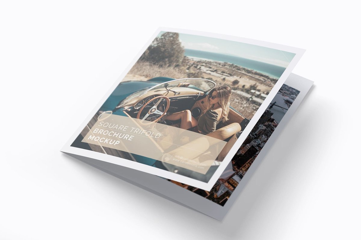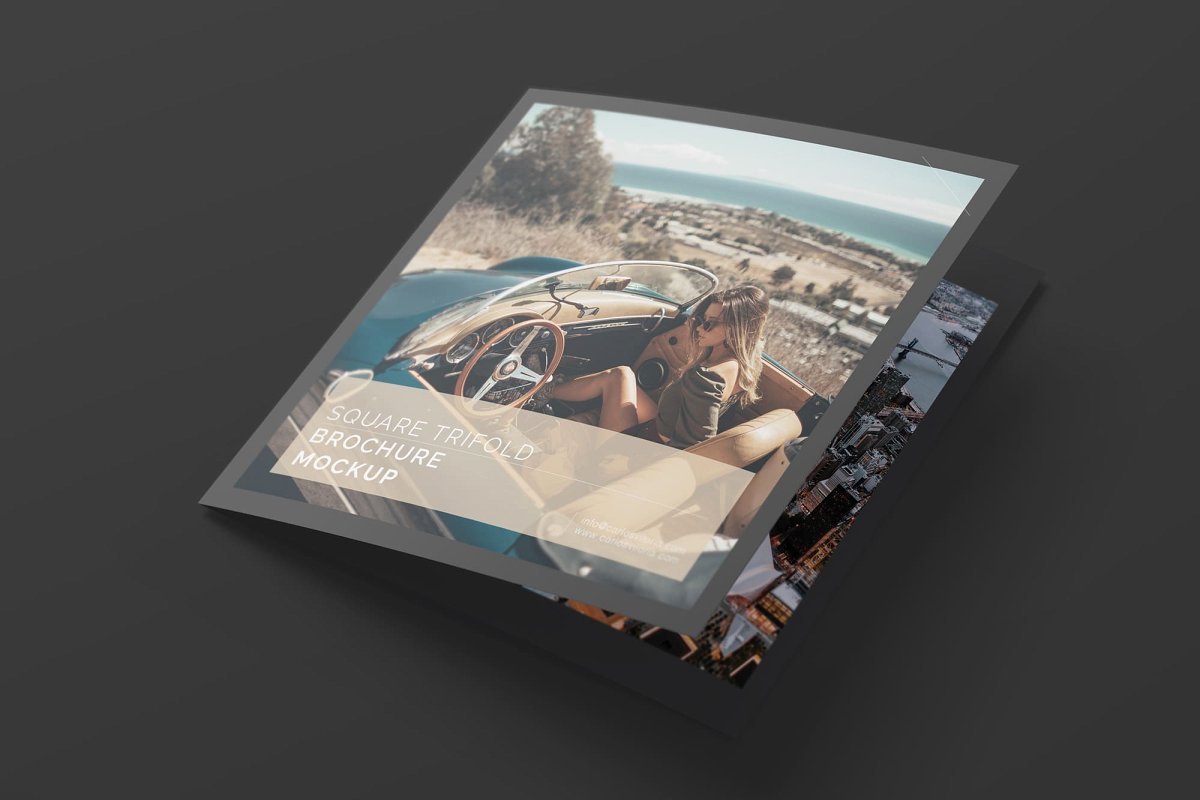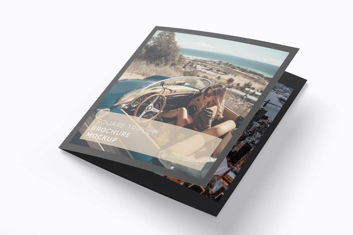 完美的样机展示了一个方形的三折页宣传册,有一个透视图,你可以看到整个封面和设计的一些内部,一个专业和优雅的样机,为设计的呈现一个非常逼真的效果。