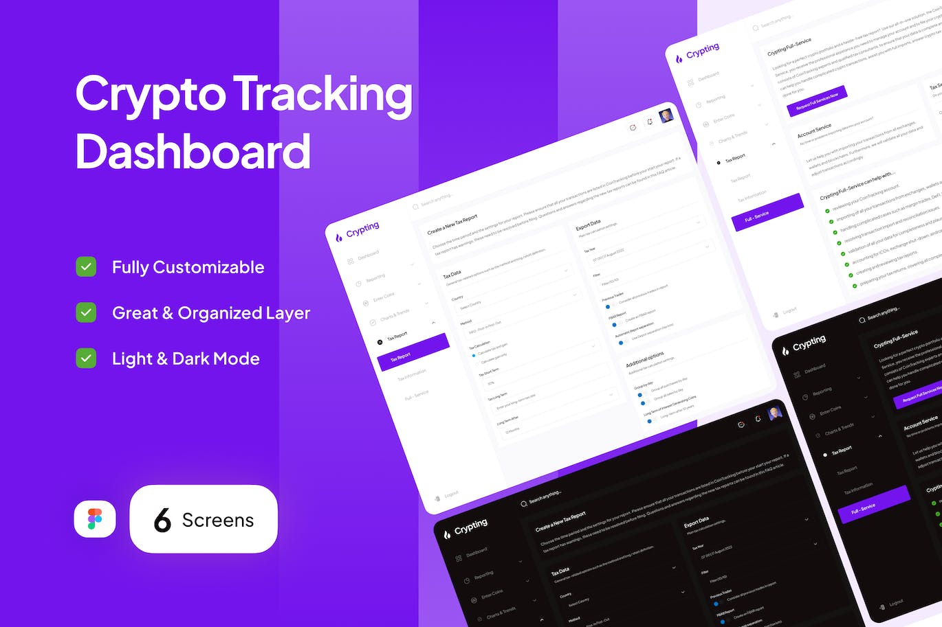 Crypting是Crypto Tracking Dashboard,具有干净、简约和现代的设计。加密是适合的,易于完全定制,以满足您的需求。在亮和暗模式下可用。易于在Figma中使用。