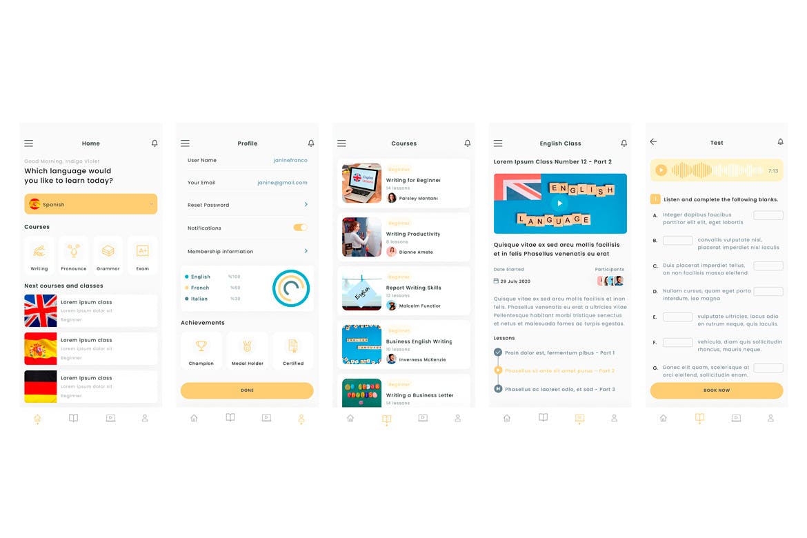 **带有5个屏幕的语言学习应用程序模板** 声明:所有作品均是用户自行上传分享,仅供网友学习交流,请勿作它用。若您的权益被侵害,请及时发邮件联系我们(v918pic@foxmail.com)。在您发送邮件后,工作人员会尽快处理,由于涉及内容不同,所需周期也不同,请您耐心等待。APPapp uiAPP应用FIGUi KitsUI套件ui设计应用程序移动应用语言学习 Behance 海报 链接