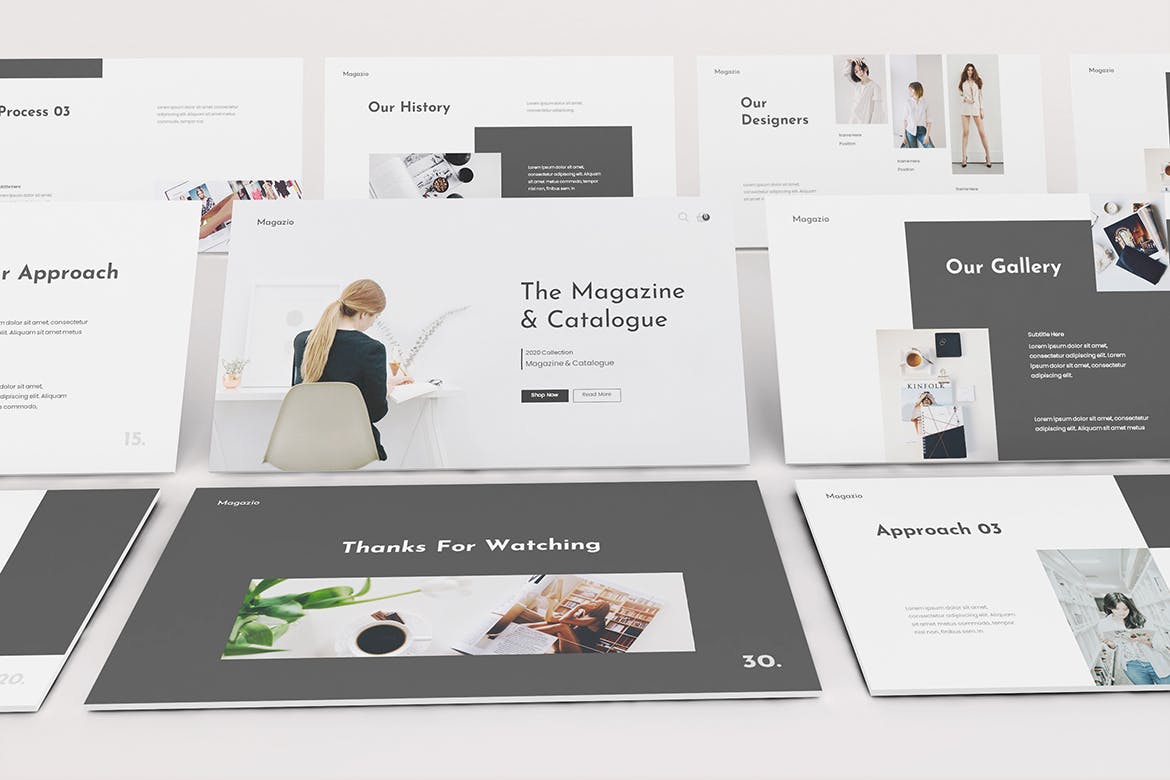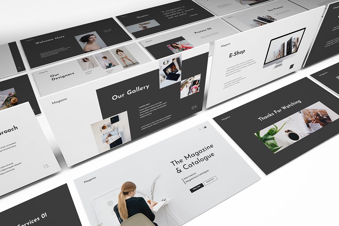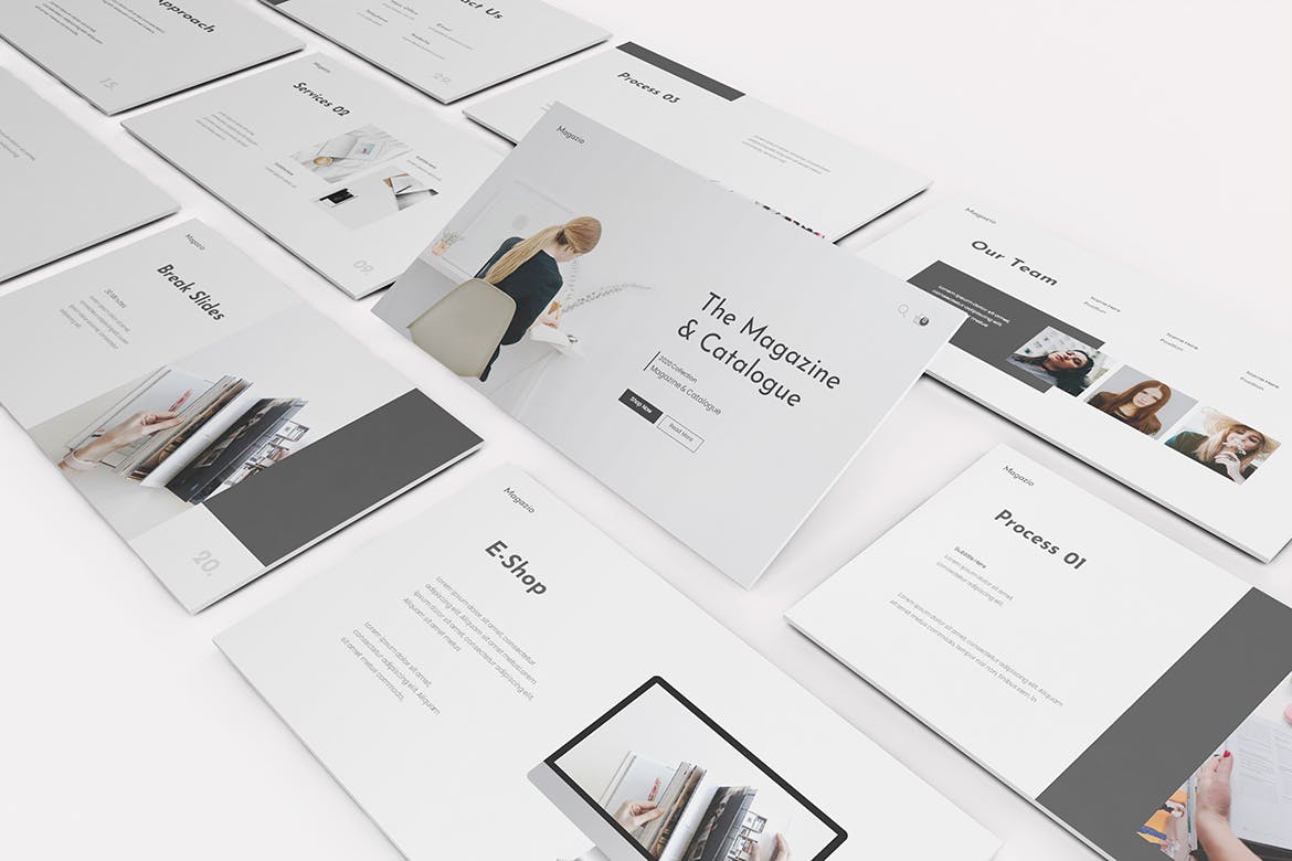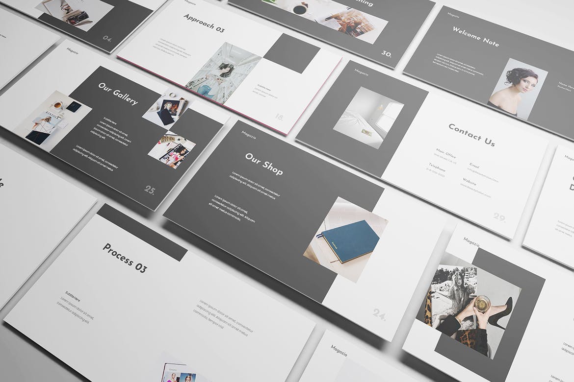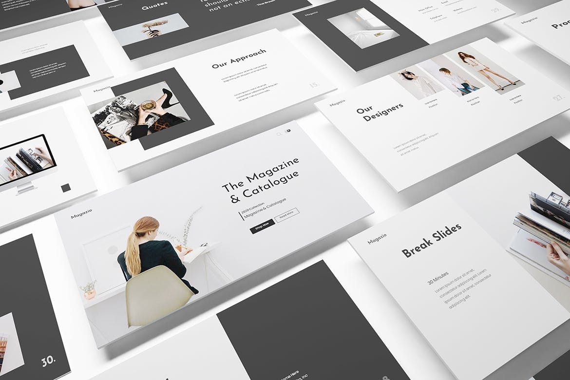 时尚杂志Lookbook演示模板的杂志Lookbook Powerpoint模板。平面和极简主义的设计使你的演讲脱颖而出,简单,干净,极简主义的设计理念。为高质量的品牌展示资产。