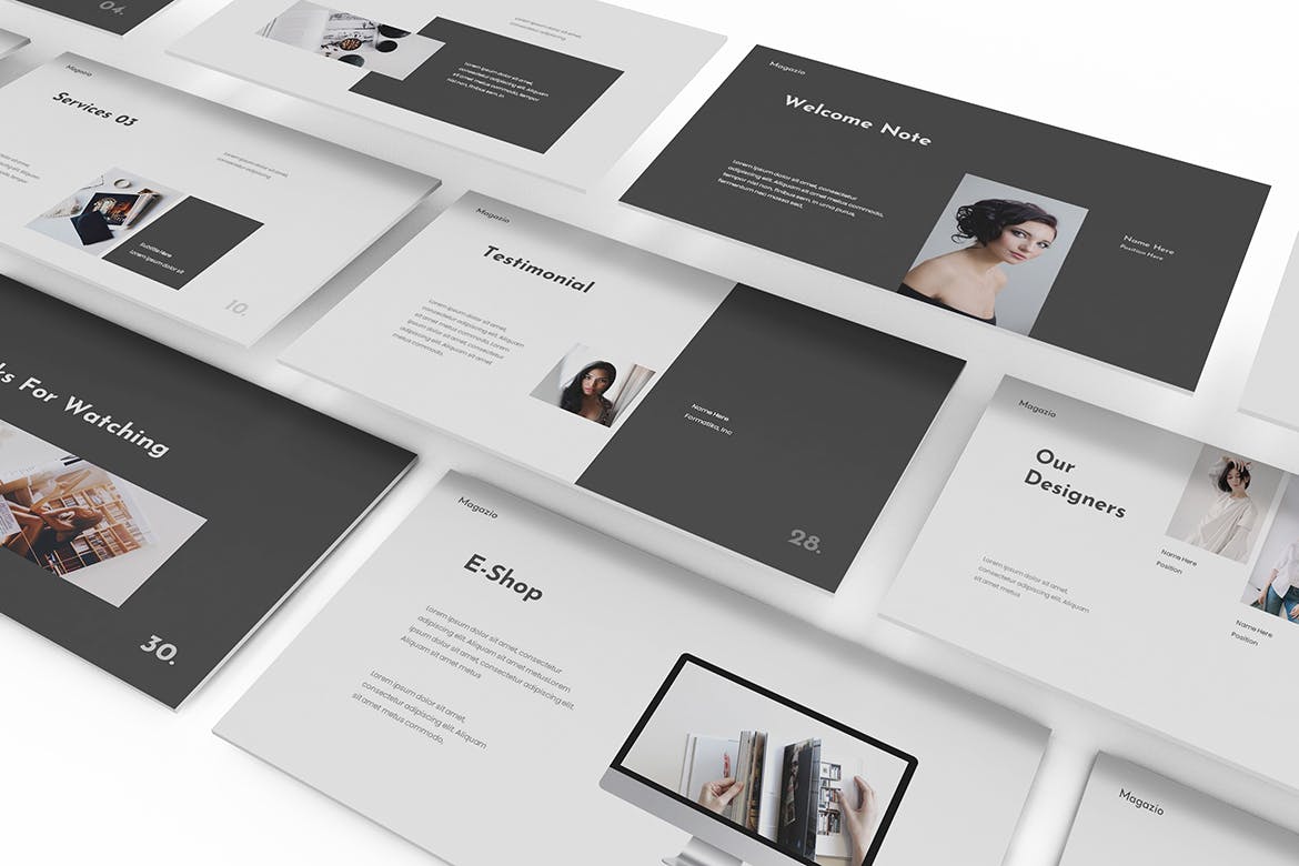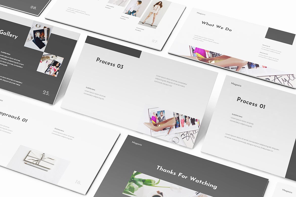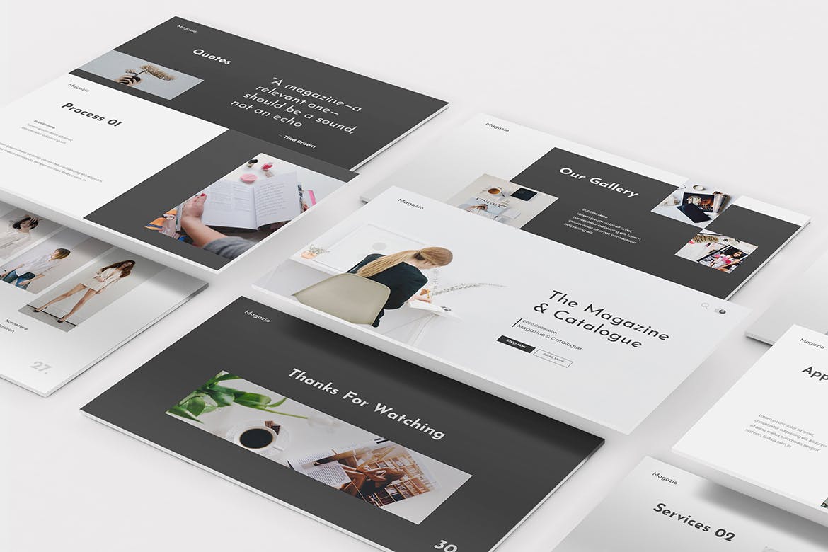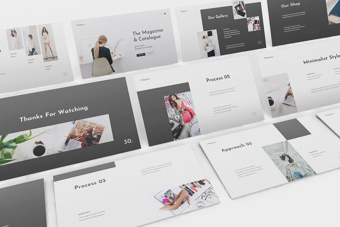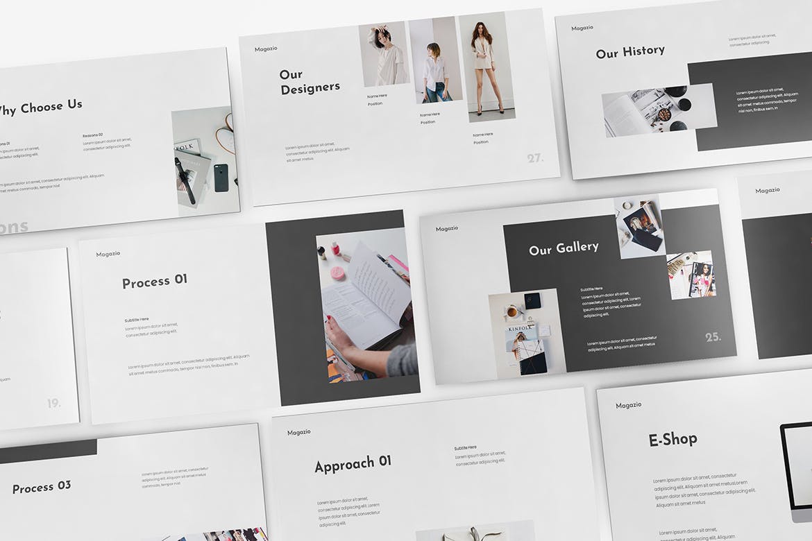 时尚杂志Lookbook演示模板的杂志Lookbook Powerpoint模板。平面和极简主义的设计使你的演讲脱颖而出,简单,干净,极简主义的设计理念。为高质量的品牌展示资产。
