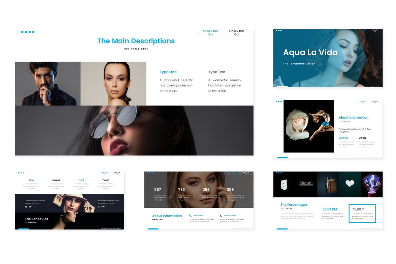 这次老不湿分享的是,时尚高端简约清新蓝色配色的高品质powerpoint幻灯片演示模板(pptx),具有第5种预制的颜色变化立即获取, Aqua La Vida-Powerpoint模板是满足商务或个人需求的多功能演示文稿的绝佳模板。此模板中的所有元素都是使用Powerpoint制作的,只能使用Powerpoint进行编辑,插入内容,将图像替换为占位符,更改颜色,以及所有演示文稿(包括动画幻灯片),并将幻灯片展示给业务合作伙伴。
