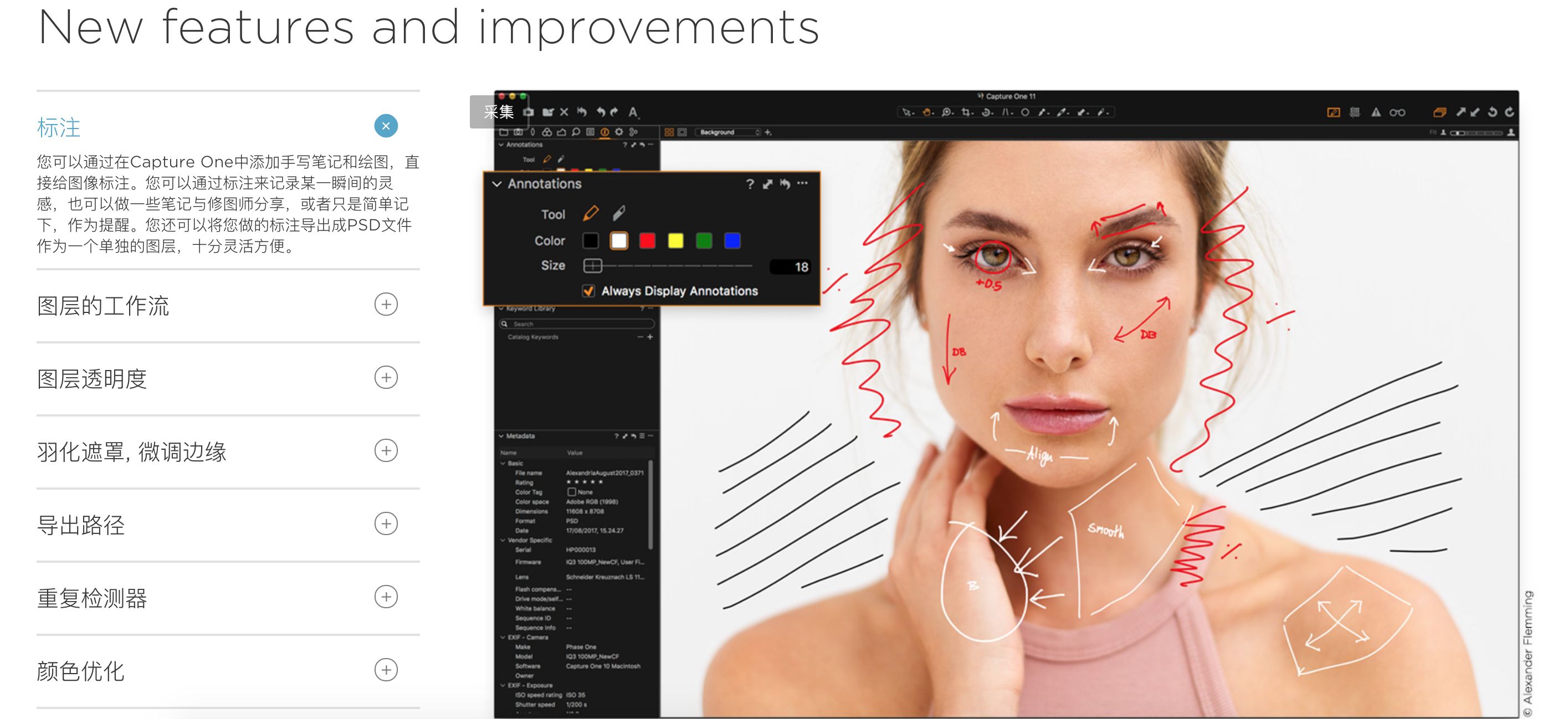 Capture One 11中新增了标注工具,可以通过鼠标或者数位板在图片中添加注释。在照片进行后期之前,将照片需要调整的局部进行标注,为后期提供参考或者指导意见。