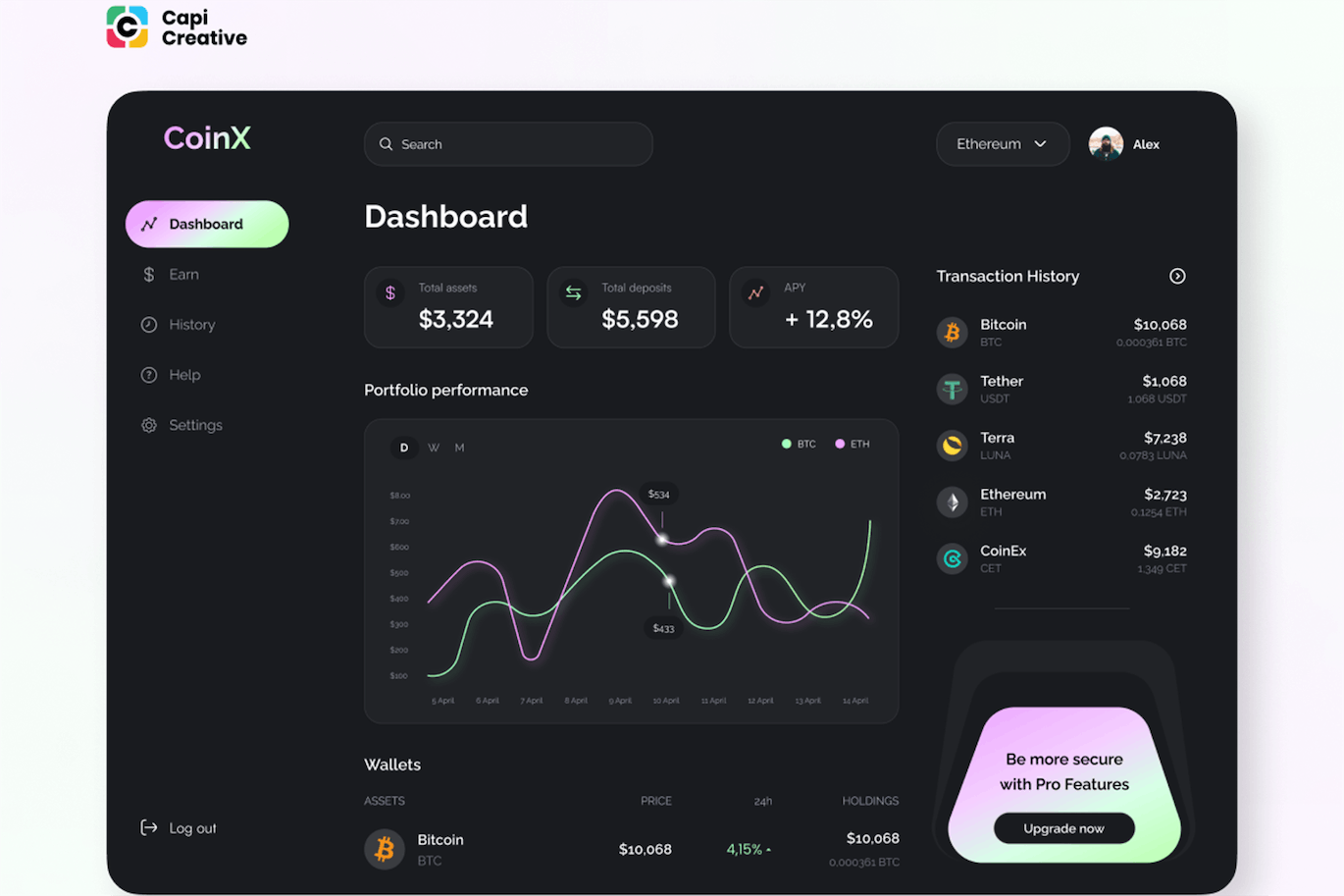 这一概念呈现了一种加密仪表板设计,具有深色模式和高对比度颜色。用户可以轻松查看总资产、存款、APY、交易历史和投资组合绩效。