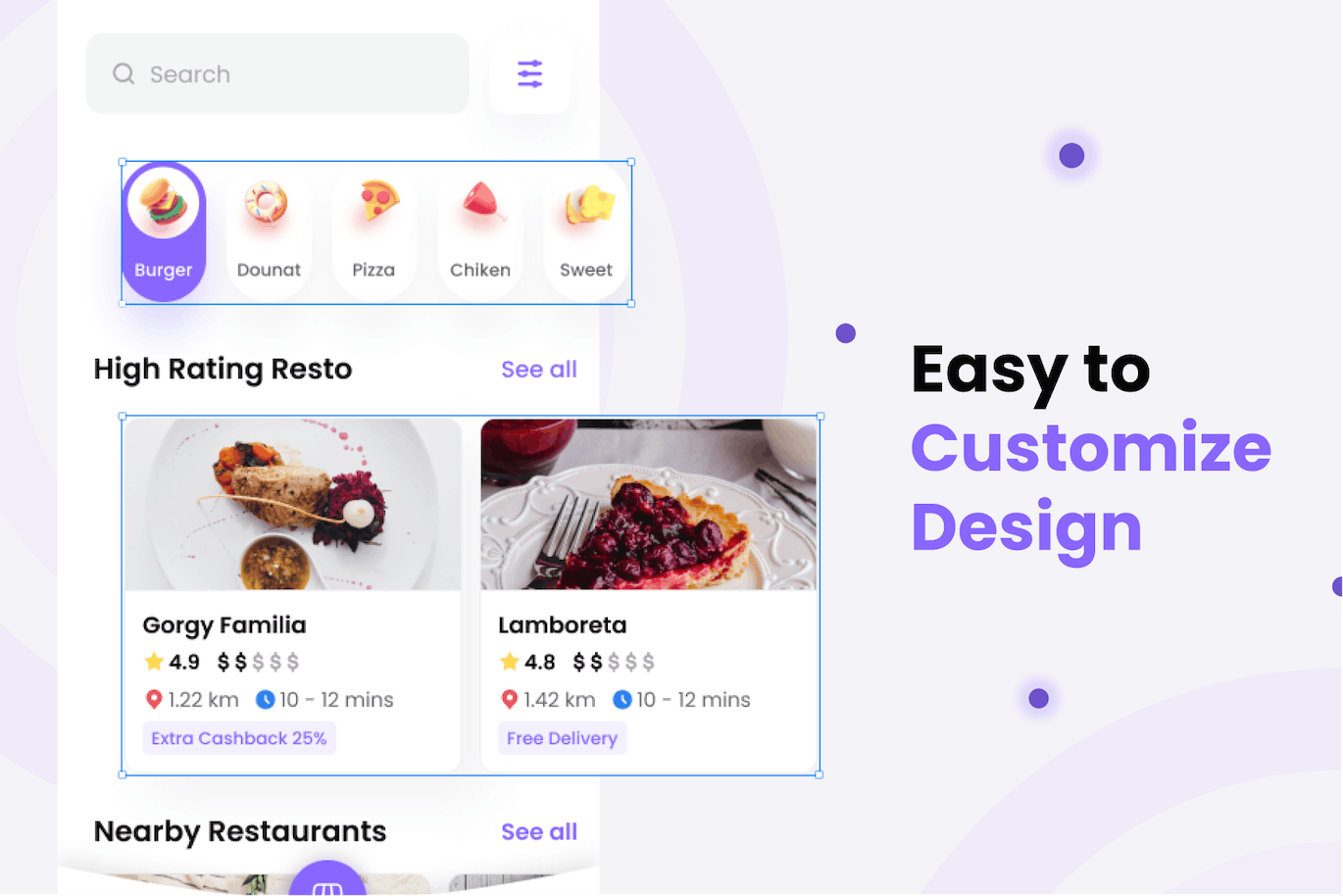 **送餐移动应用程序UI套件**将帮助您的餐厅/咖啡馆/送餐服务移动应用程序。
