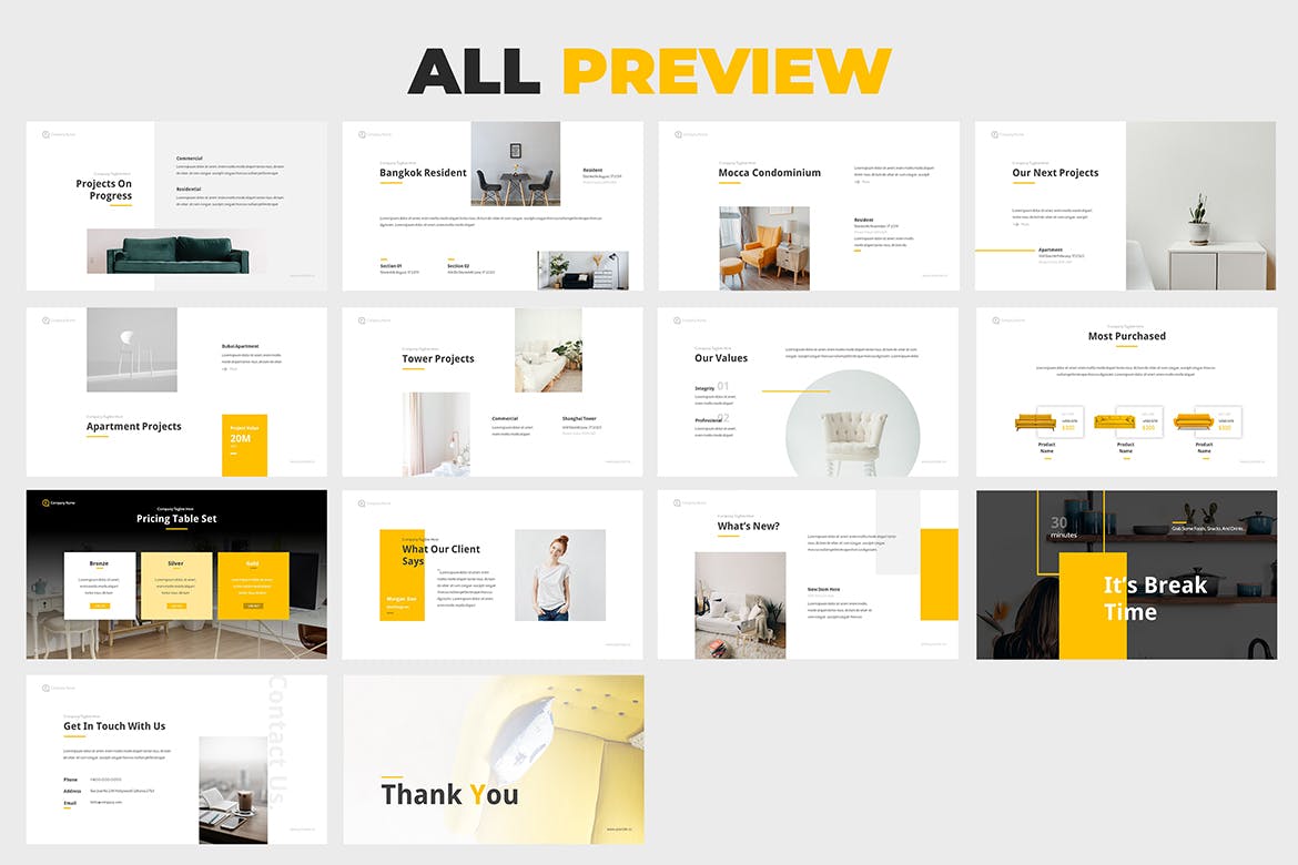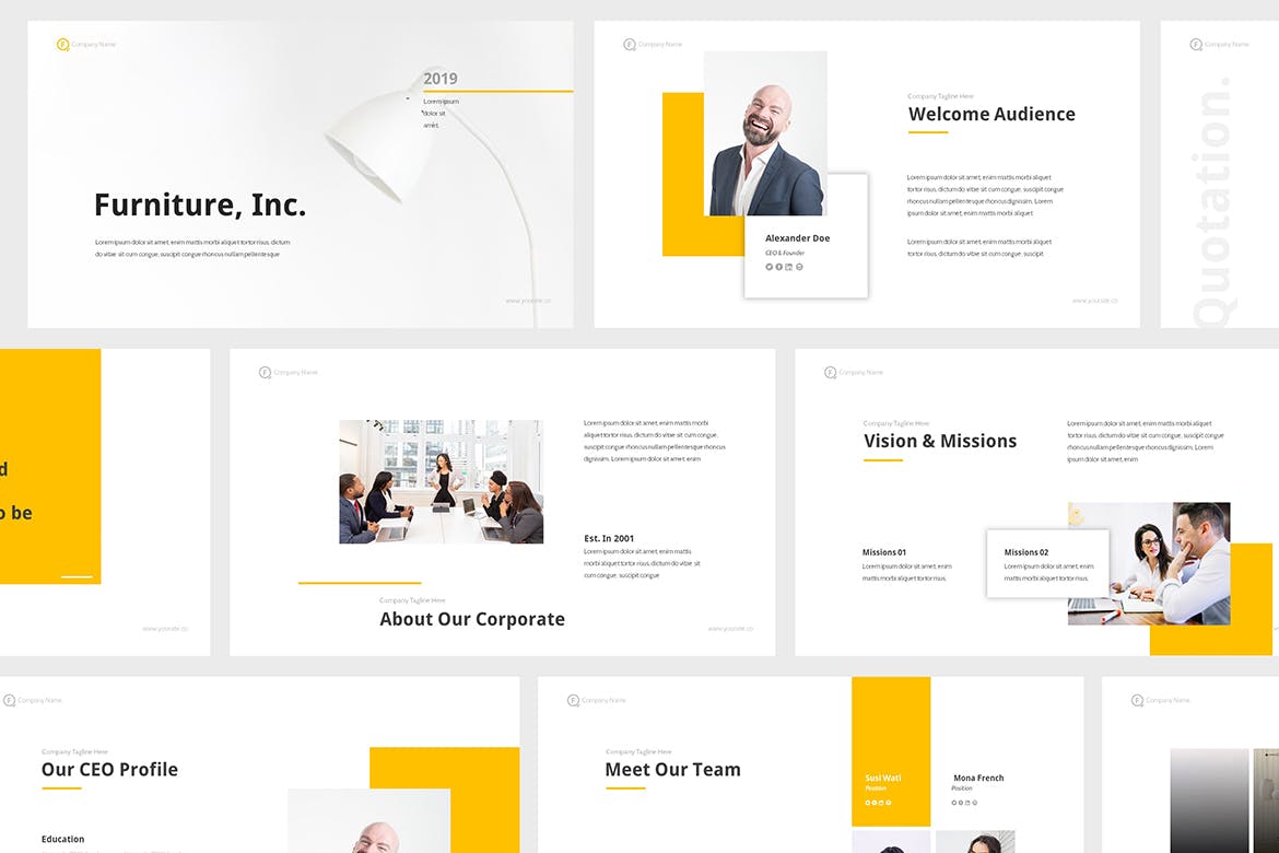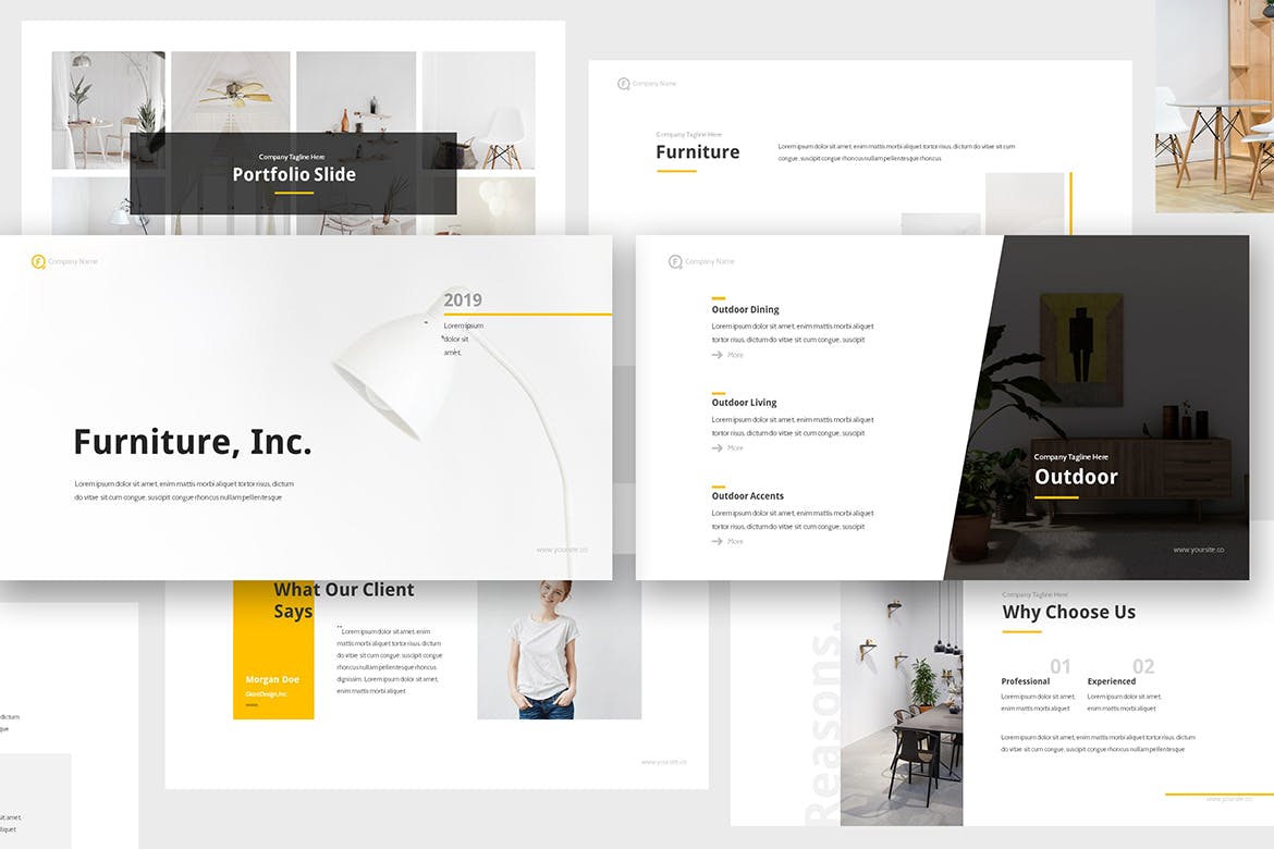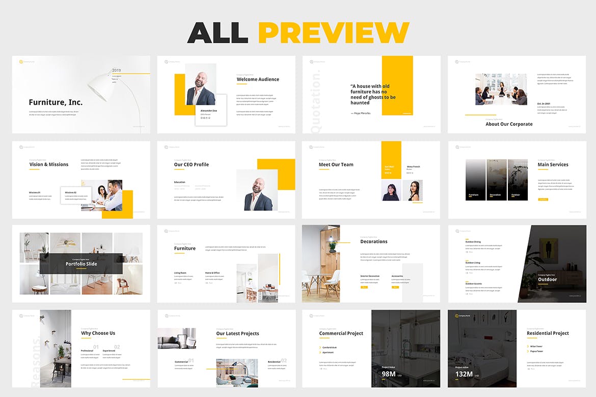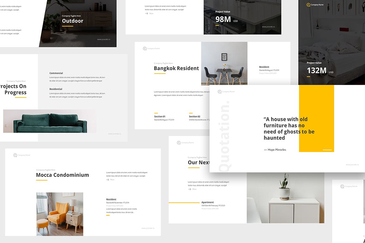 是一个室内设计、家具专卖店营销和促销演示文稿,设计采用专业和平面的设计元素。本演示将带您进入另一个层次的营销和促销活动。