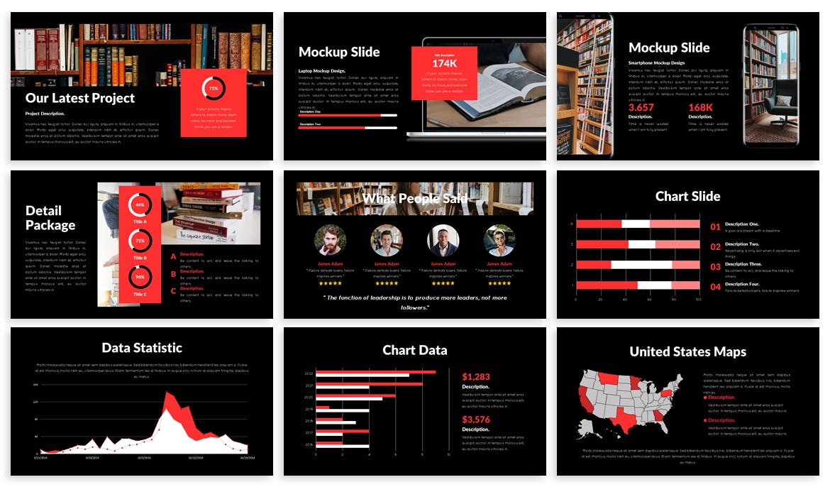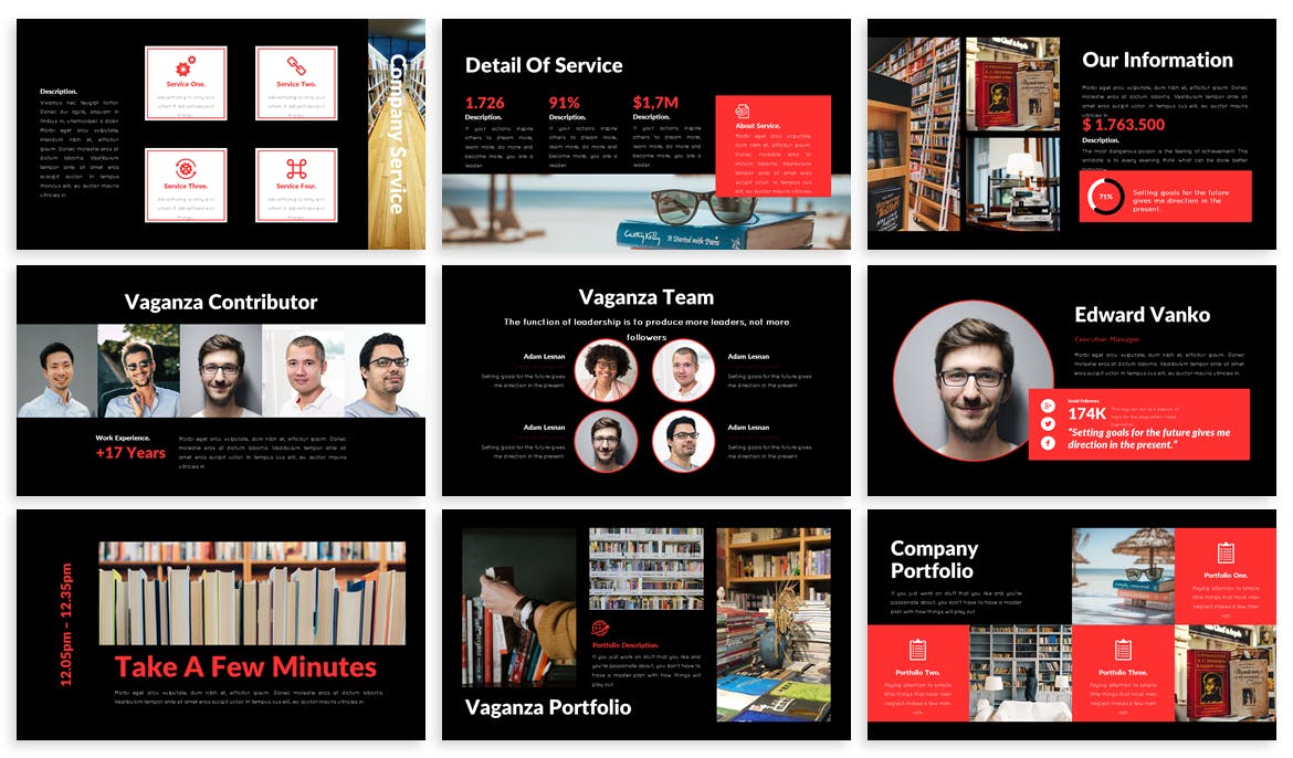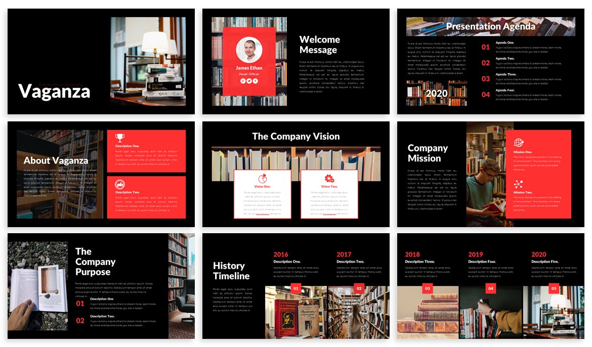 黑色图书馆谷歌幻灯片PPTX模板与5个预先制作的颜色变化得到现在,我们的模板是一个完美的模板,为您的个人需要与多用途的演示。做了一个完美的演讲,给你的客户留下了深刻的印象。