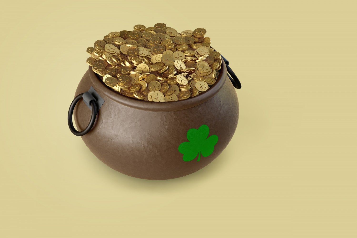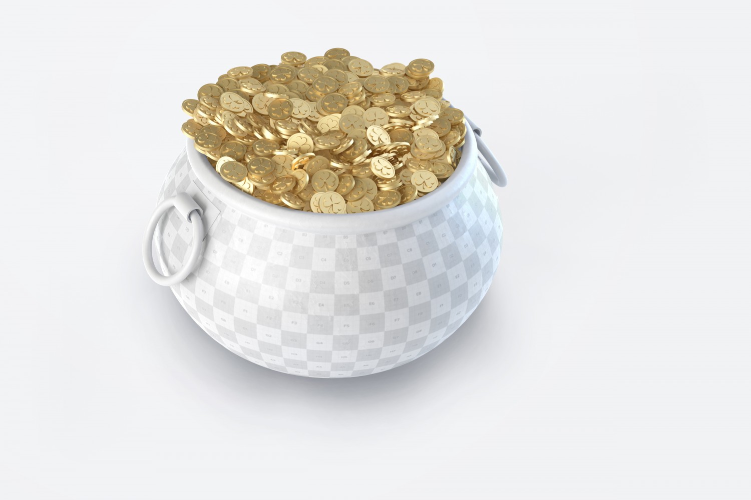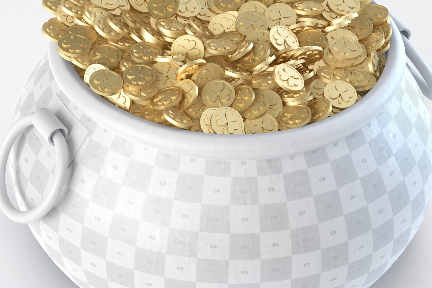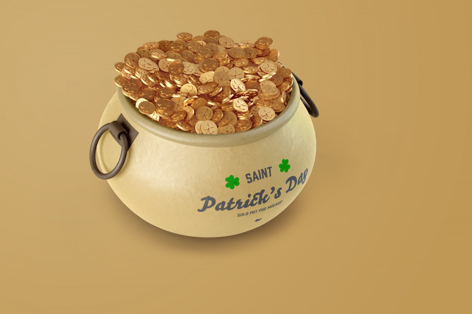 从正面看,我们为Photoshop提供了一个令人难以置信的样机,并带有一罐金。 我们创建了此圣帕特里克节金币罐样机,特别是为了庆祝圣帕特里克节。将该项目放置在另一个文件中非常容易且有用,因为该对象与背景完全分离,因此使用Photoshop 3D图层可以轻松编辑内容。 只需单击几下,您就可以在罐子上添加庆祝文字。 您甚至可以以非常简单和快速的方式自定义细节,例如阴影的强度,照明,修改锅和底部的颜色。