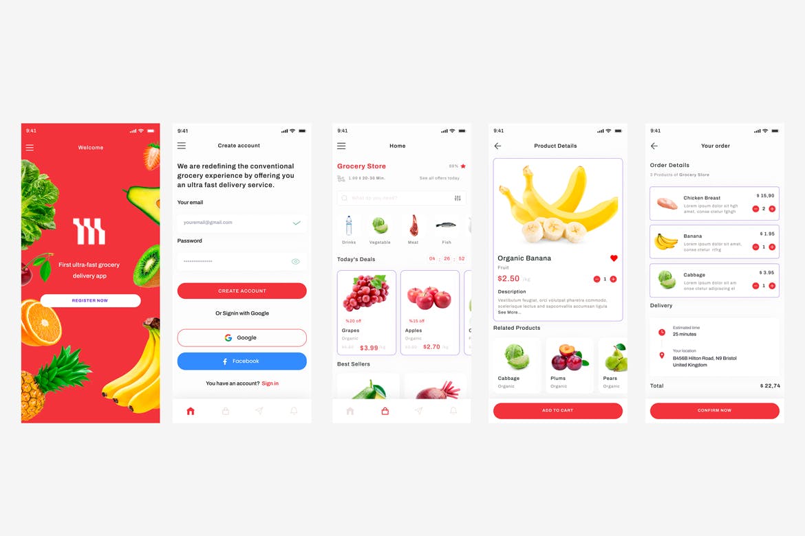 **具有5个屏幕的杂货店应用程序模板**
