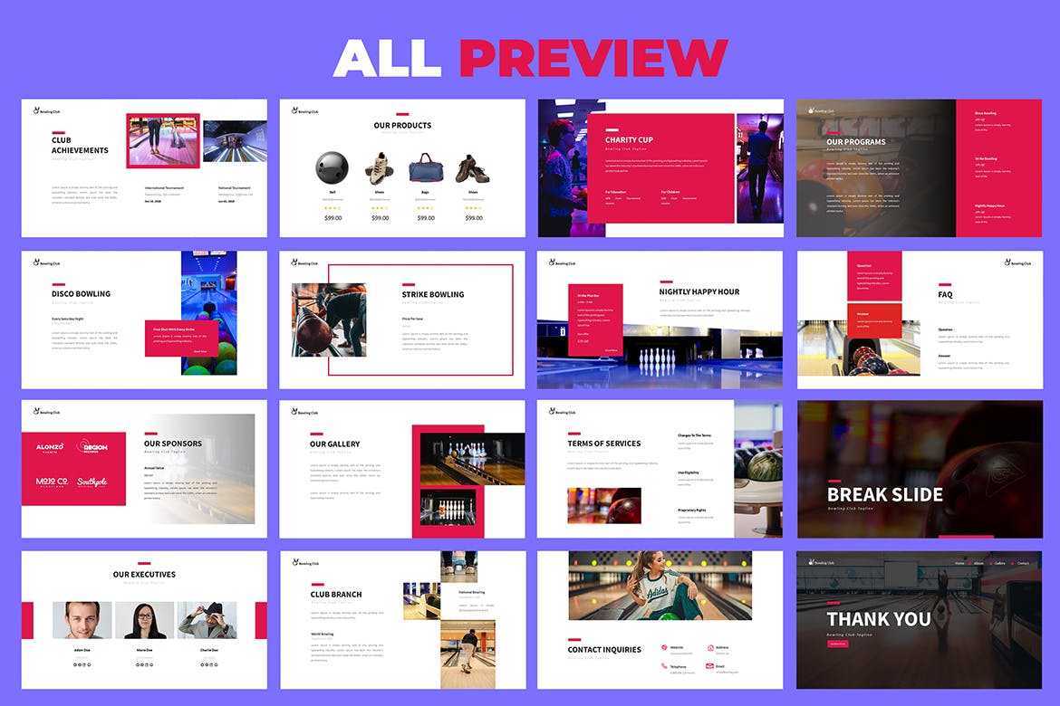 这次老不湿分享的是,时尚高端简约保龄球馆运动powerpoint幻灯片演示模板(pptx),它为您提供有效的方式来介绍您的保龄球业务,并带有平面设计,简洁,简约,现代的演示文稿。如果您正在寻找专业模板,则可以选择该模板。
