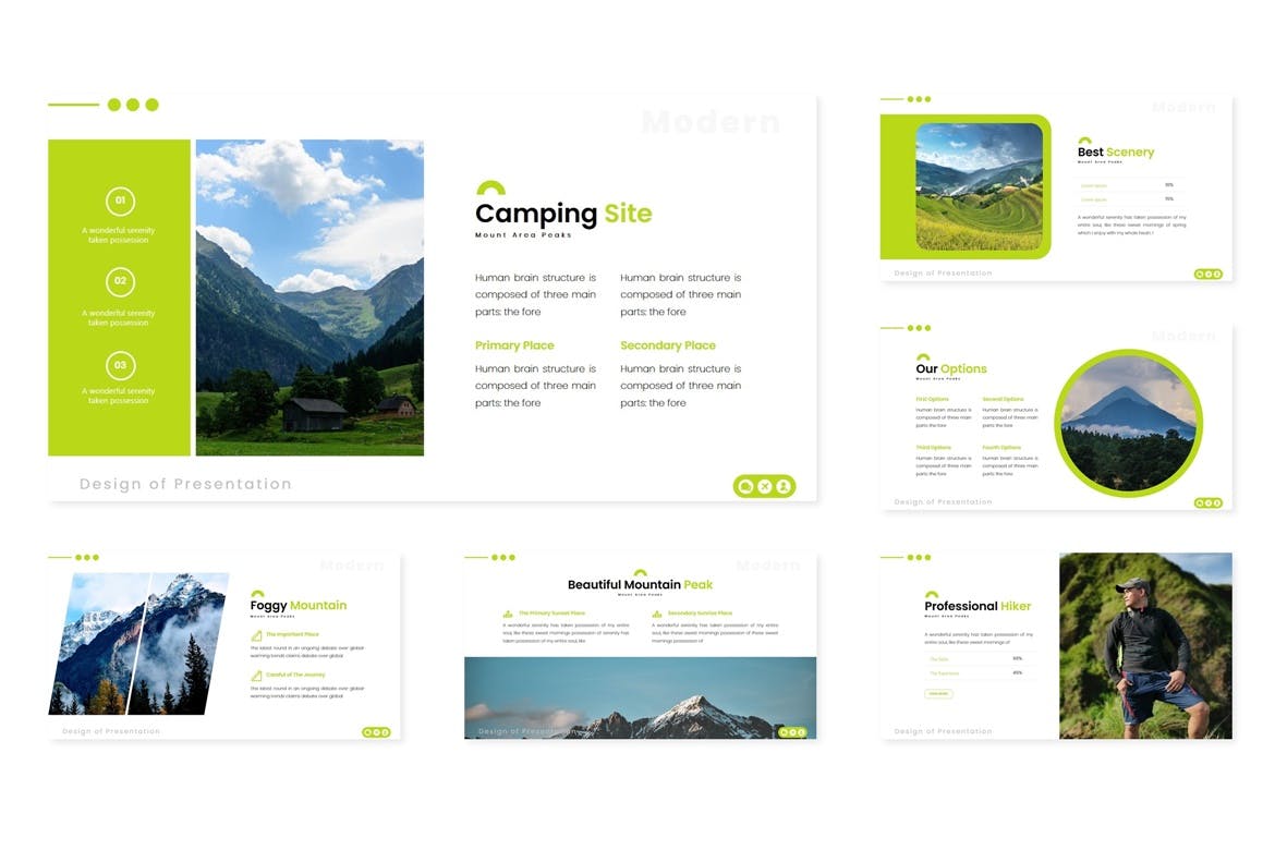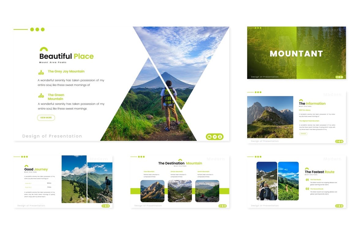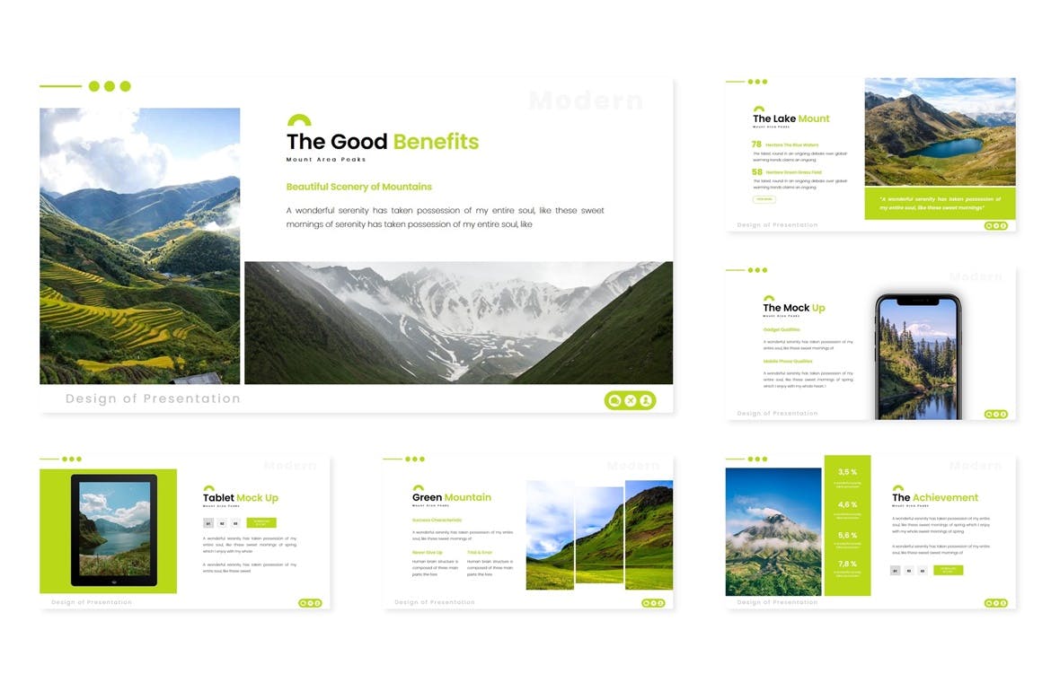 这次老不湿分享的是,简约时尚高端清新多用途的powerpoint幻灯片演示模板(pptx),具有第5种预制的颜色变化立即获取, Mountant-Powerpoint模板是满足商务或个人需求的多功能演示文稿的理想模板。该模板中的所有元素都是使用Powerpoint制作的,只能使用Powerpoint进行编辑,插入内容,将图像替换为占位符,更改颜色,以及所有演示文稿(包括动画幻灯片),并将幻灯片展示给业务合作伙伴。快乐滑块!