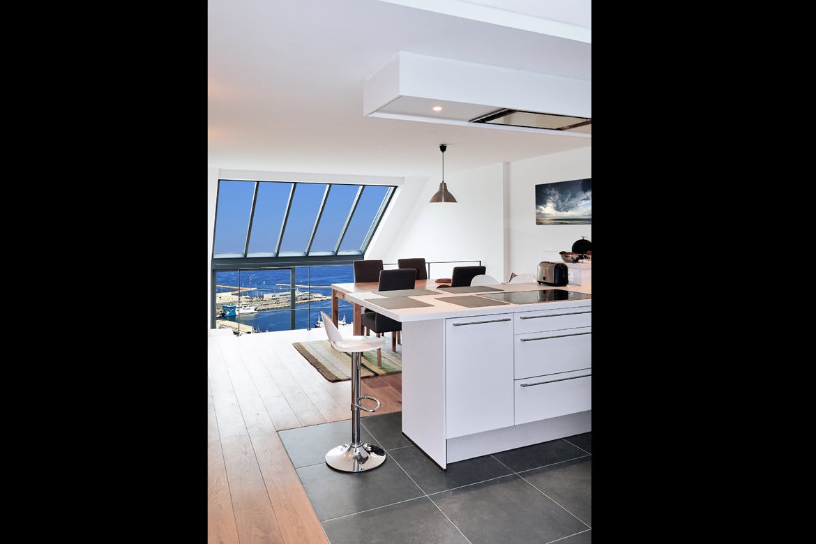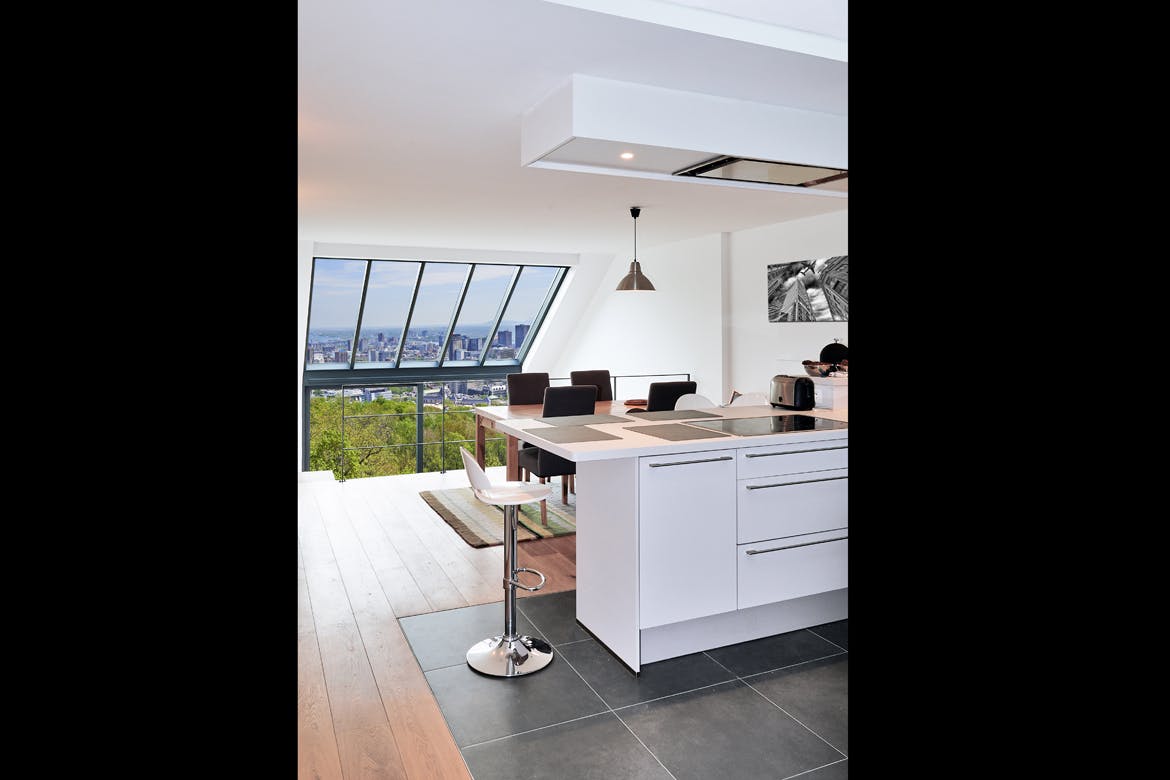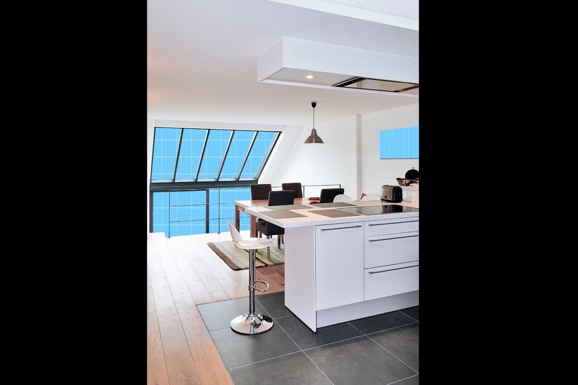 阁楼场景窗户效果图展示样机,现代阁楼厨房和饭厅,大窗户,可欣赏窗外风景。 易于定制,通过此静态样机,可以节省时间并让您的品牌看起来抢眼。 使用智能对象轻松放置您的设计,双击“智能层”,复制并粘贴图稿,保存即可完成!